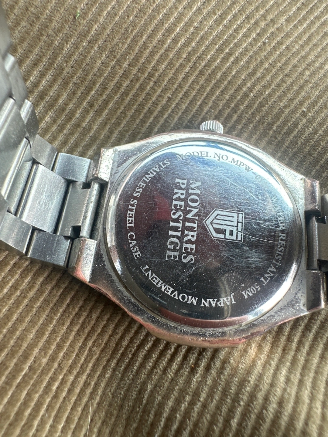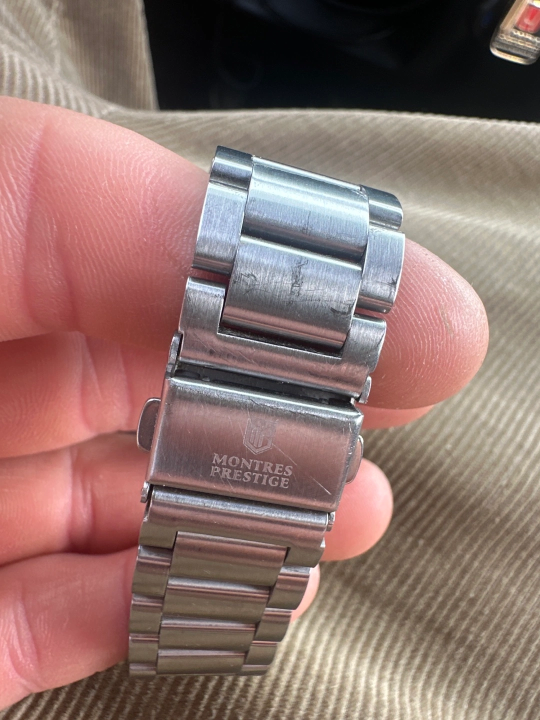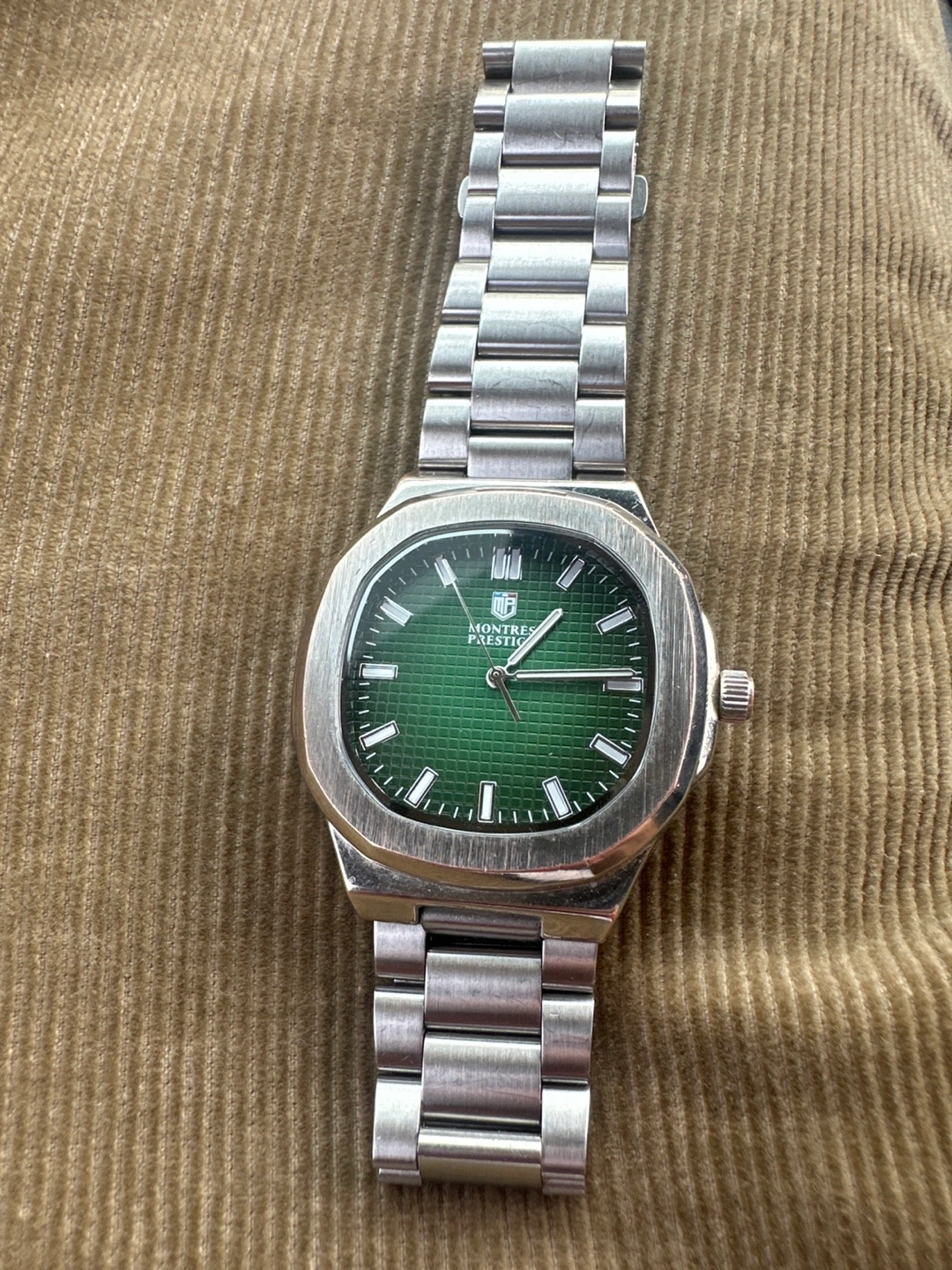 Selling a Montres Prestige watch with a green dial and stainless steel bracelet. It's in good condition and has a stylish look! The watch is water-resistant to 50M. The model number is MPW-0 Silver 925 chain rope and bracelet as well