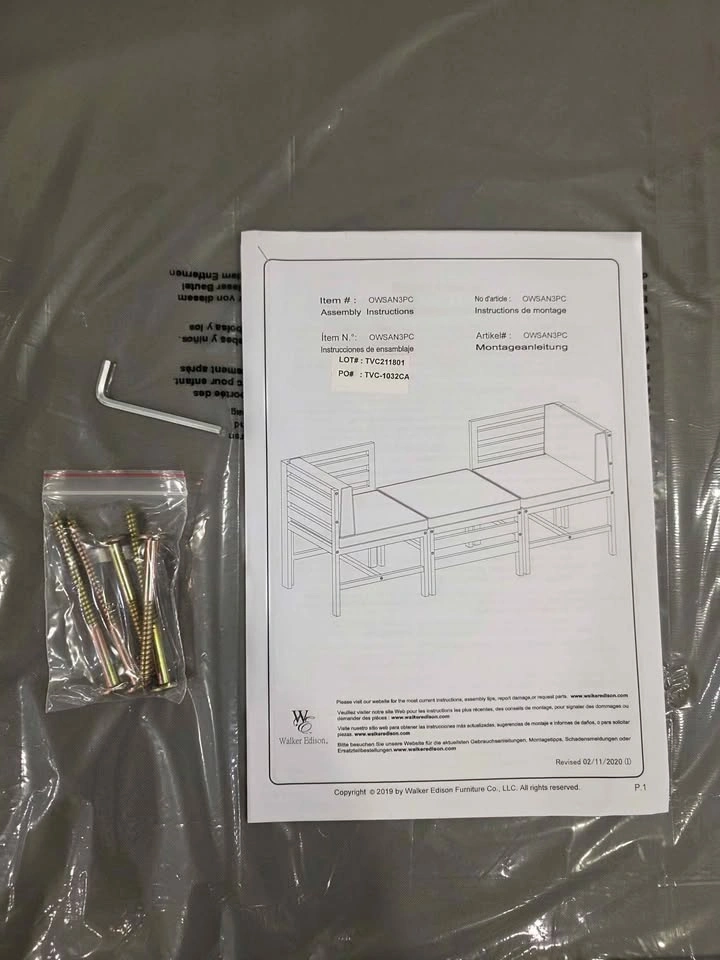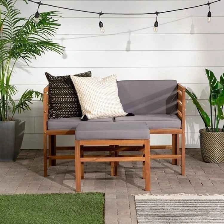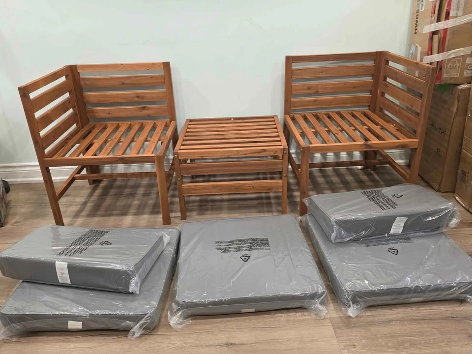 Beautiful and modern outdoor patio set featuring two corner chairs and one ottoman. Made with solid acacia wood in a brown finish and thick, comfortable weather-resistant cushions (grey). Stylish, durable, and space-saving – perfect for balconies, patios, or small backyard setups. Brand new, fully assembled – never used. Premium acacia wood frame for outdoor durability Comfortable foam-filled cushions still in original plastic Modular design lets you rearrange as needed Set includes: 2 corner chairs 1 ottoman 5 grey cushions (seat & back)