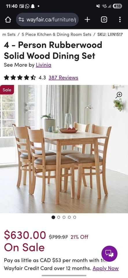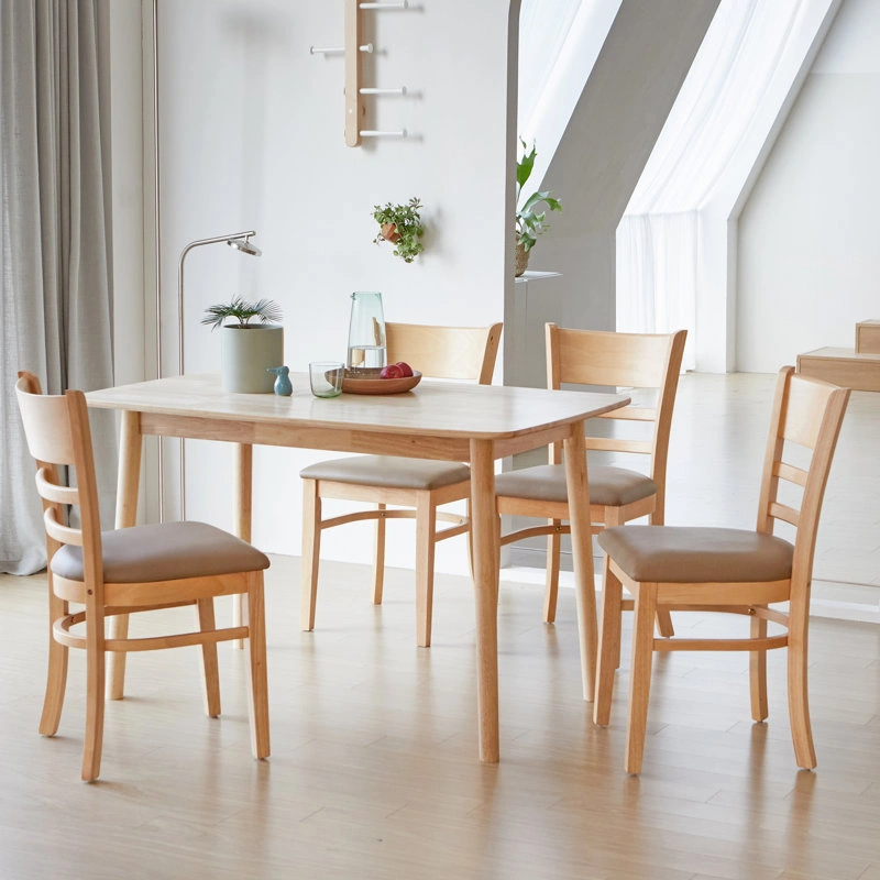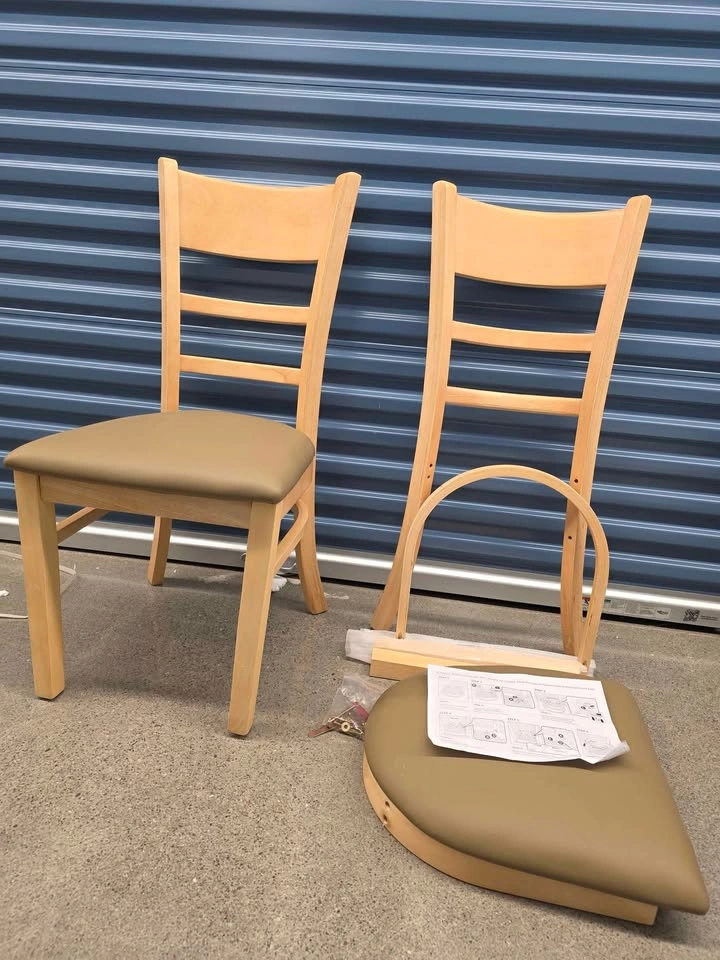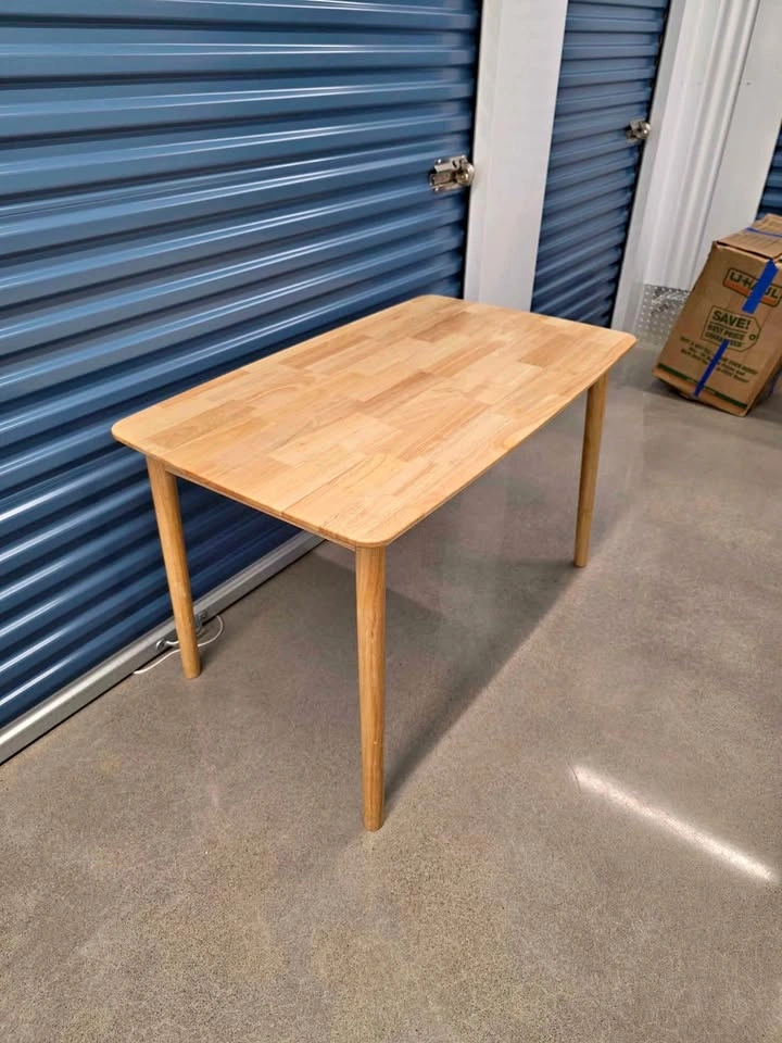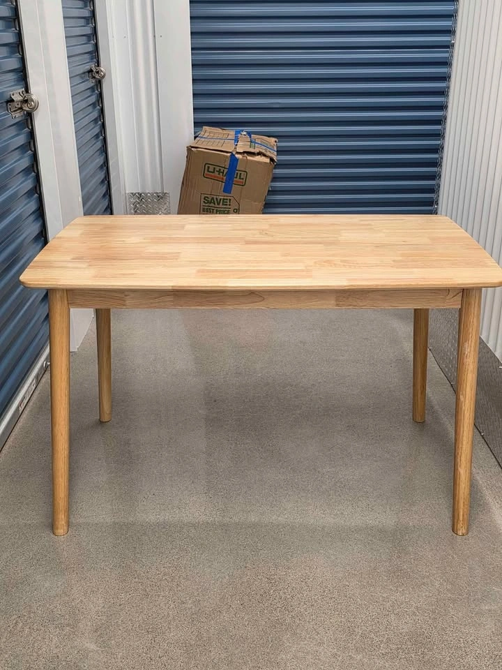 Solid wood dining set with a smooth rectangular table and two padded chairs in a natural finish. Crafted from durable rubberwood for long-lasting use. Clean, modern design perfect for kitchens, dining rooms, or compact spaces. Set includes 1 table and 2 chairs (originally comes with 4 chairs – only 2 available). Brand new, partially assembled, pulled from a liquidation pallet. Can be sold assembled or disassembled. Pickup only.