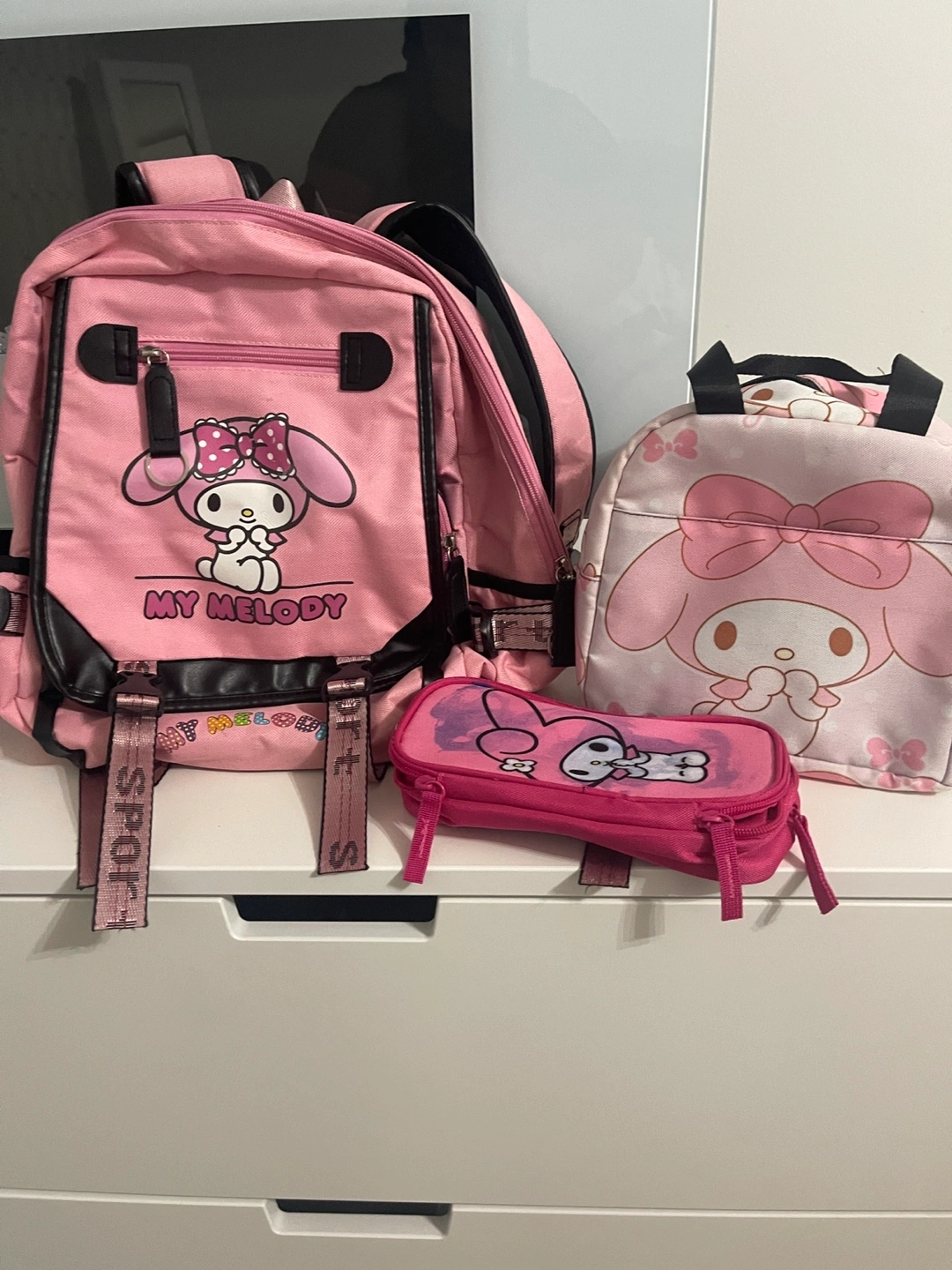 X-Large bag with tons of pockets . Very clean good condition. Washed and ready to use -My melody Lunch bag very clean -My melody Also including a pencil case . Does have some marker stains but it but has a lot of compartments Thickson and Dundas Whitby