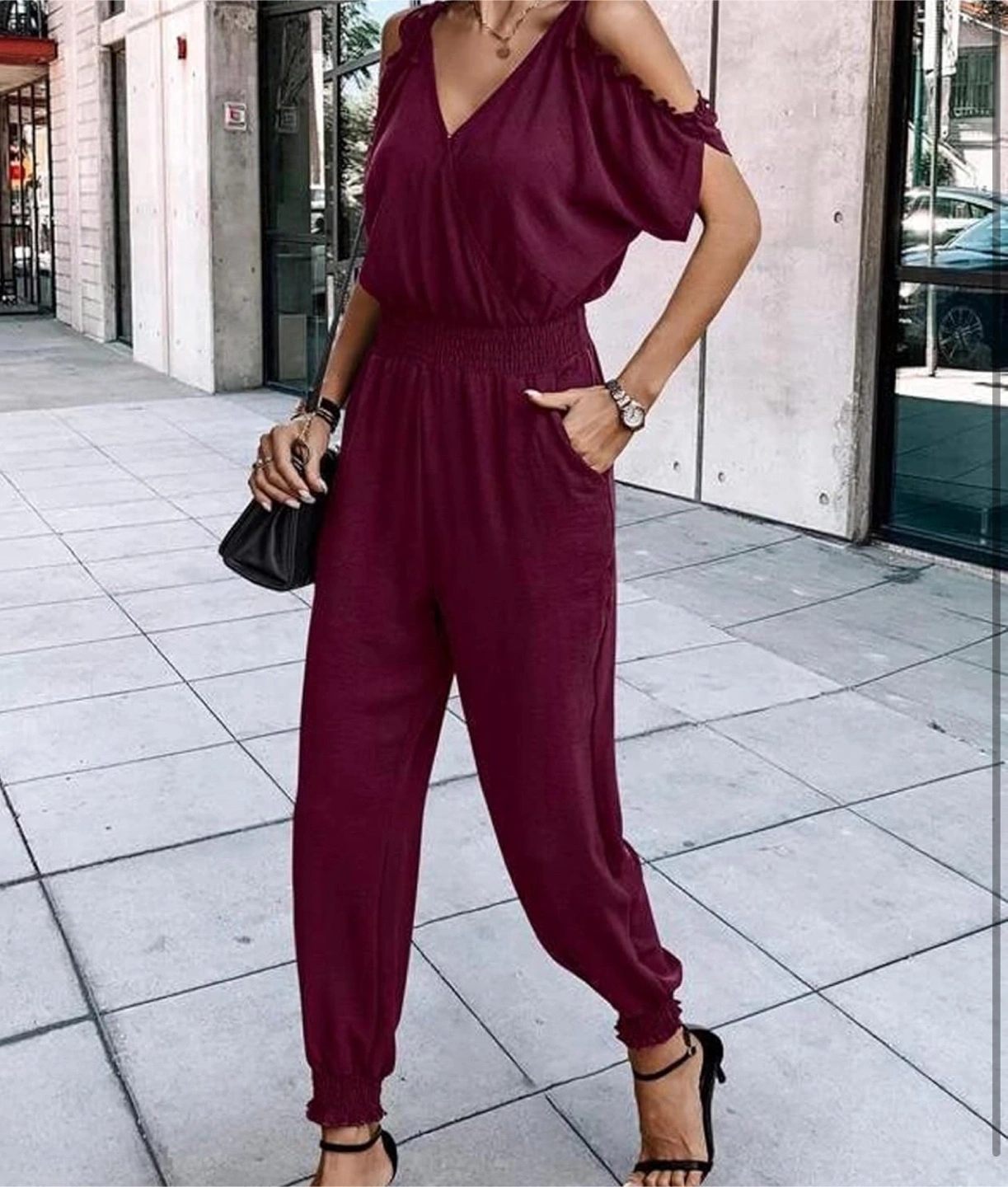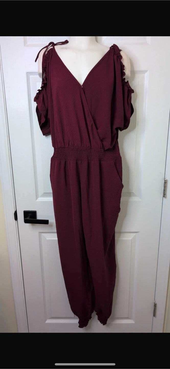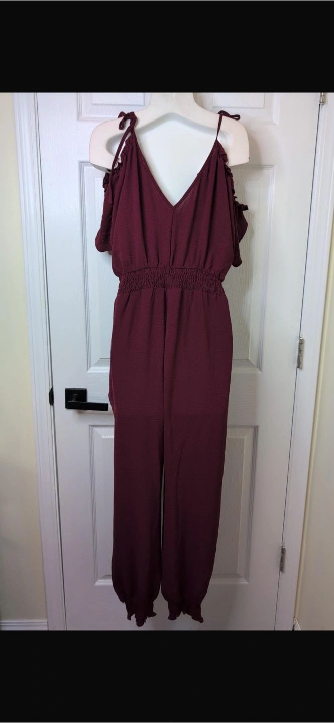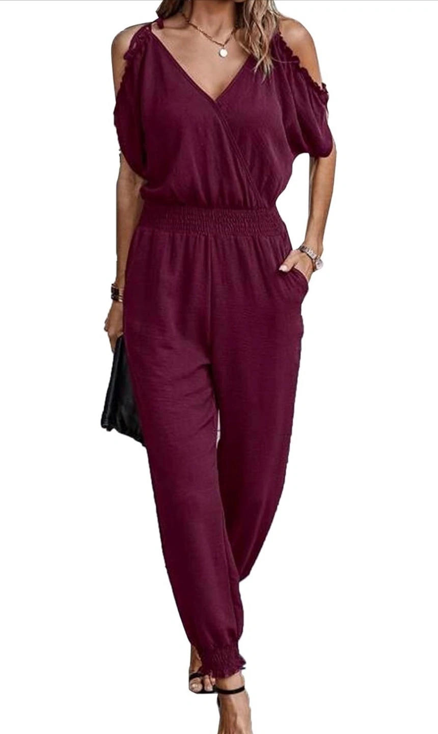 New! Beautiful stylish burgundy jumpsuit with cold shoulder cutouts! It features a flattering V-neck and a comfortable elastic waistband. Perfect for a casual day out or a dressed-up evening look.