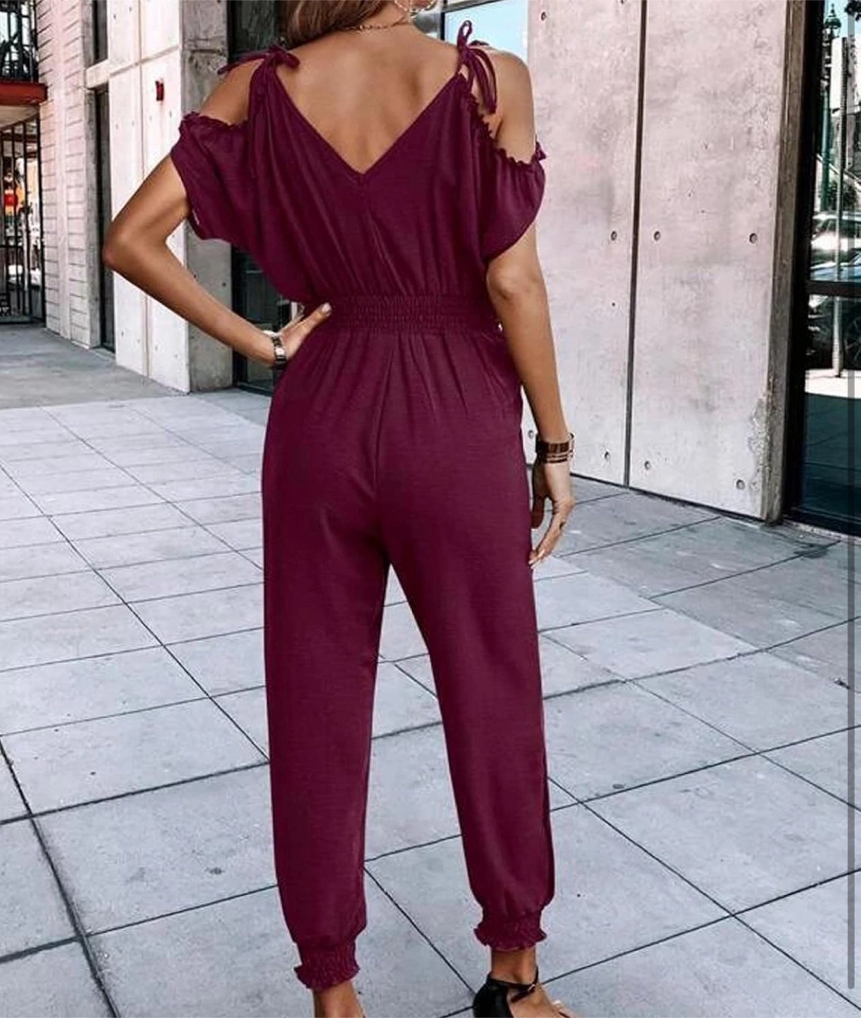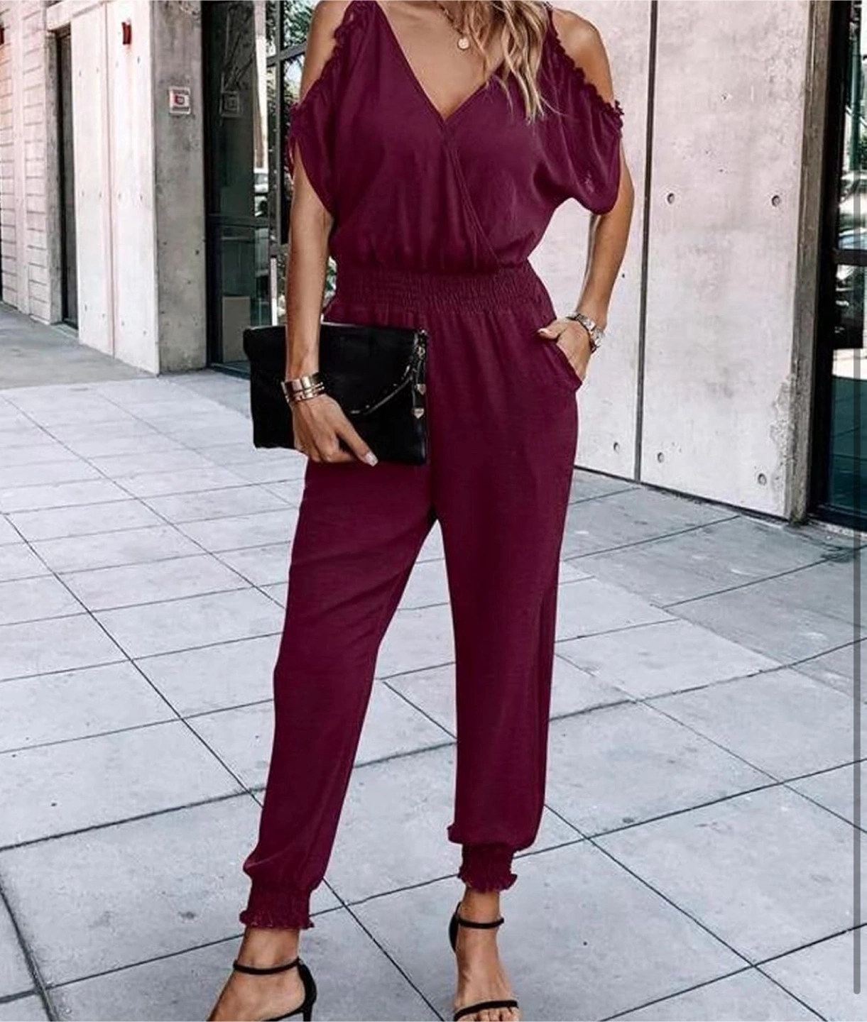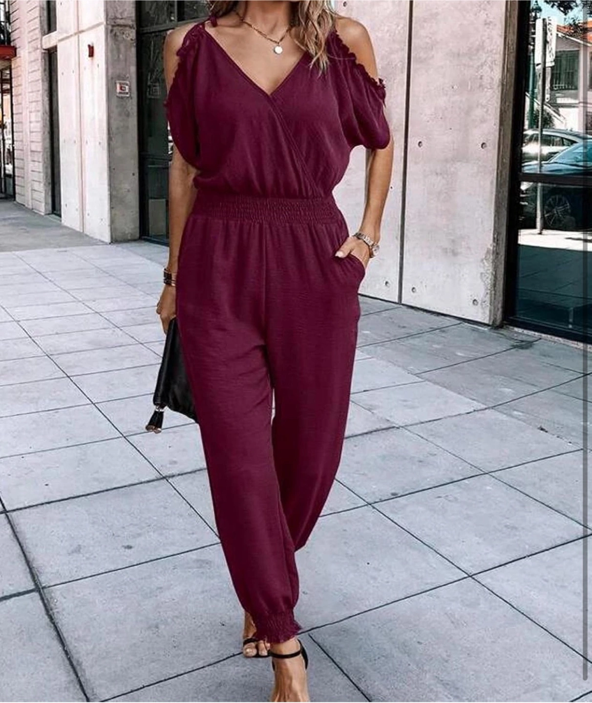 New! Beautiful stylish burgundy jumpsuit with cold shoulder cutouts! It features a flattering V-neck and a comfortable elastic waistband. Perfect for a casual day out or a dressed-up evening look.