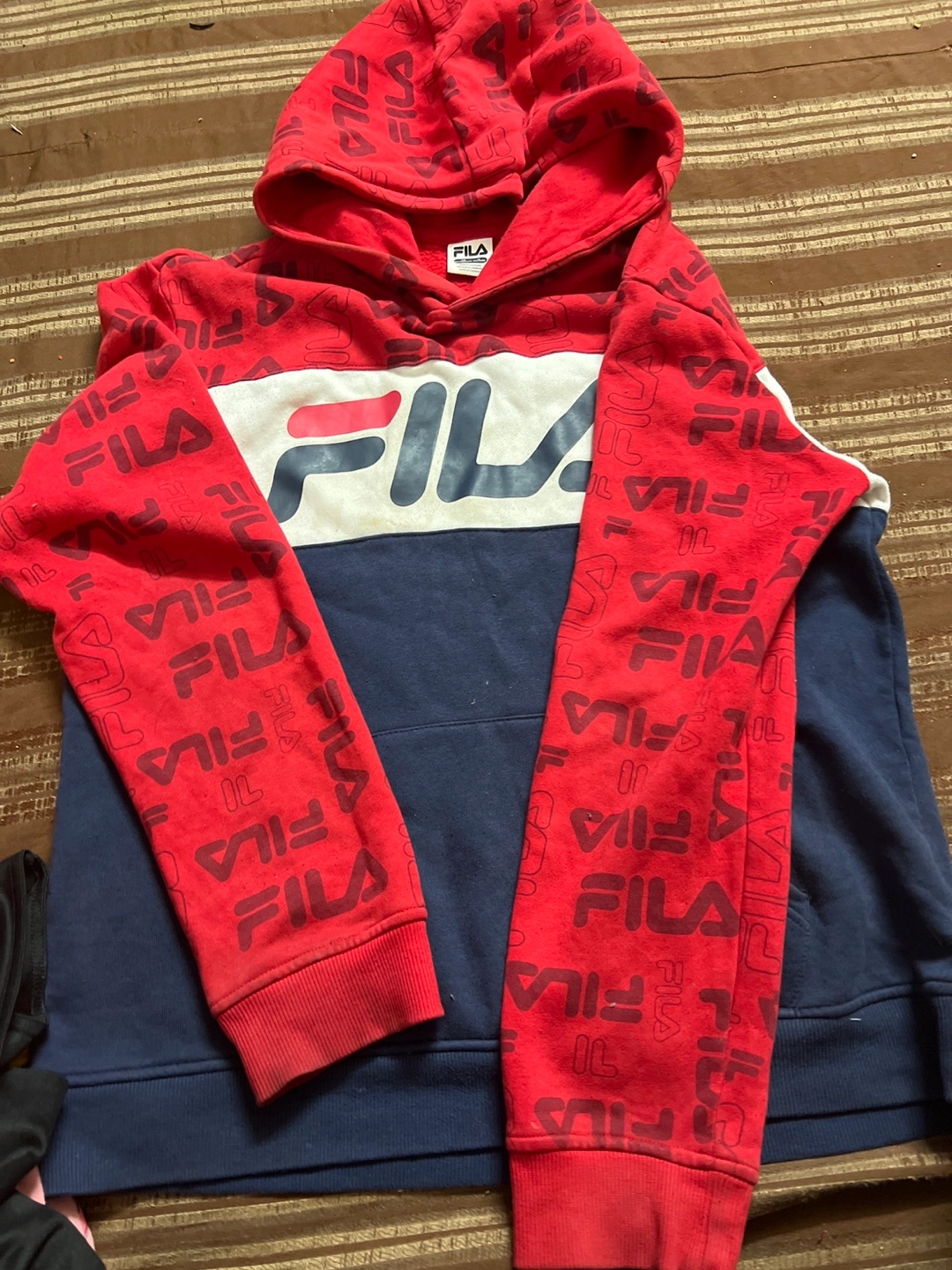 Fila hoodie in size XXL (18/20). The hoodie is red and navy with the Fila logo printed all over it. Perfect for keeping cozy!