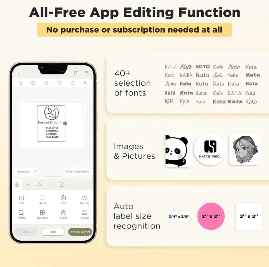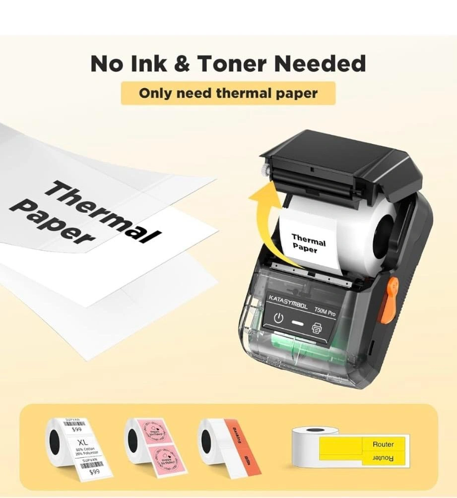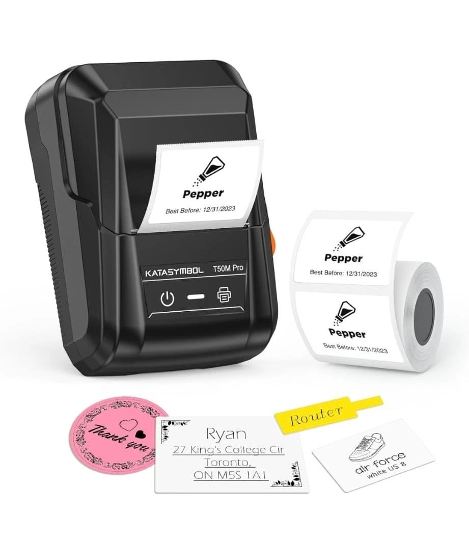 Looking to sell a KATASYMBOL T50M Pro label printer! It's in great condition and ready to help you with all your labeling needs. It supports various style labels and prints 3/4 - 2 inch wide labels. No ink or toner is needed, as it uses thermal paper. Plus, it has an all-free app editing function, so no purchase or subscription is needed!