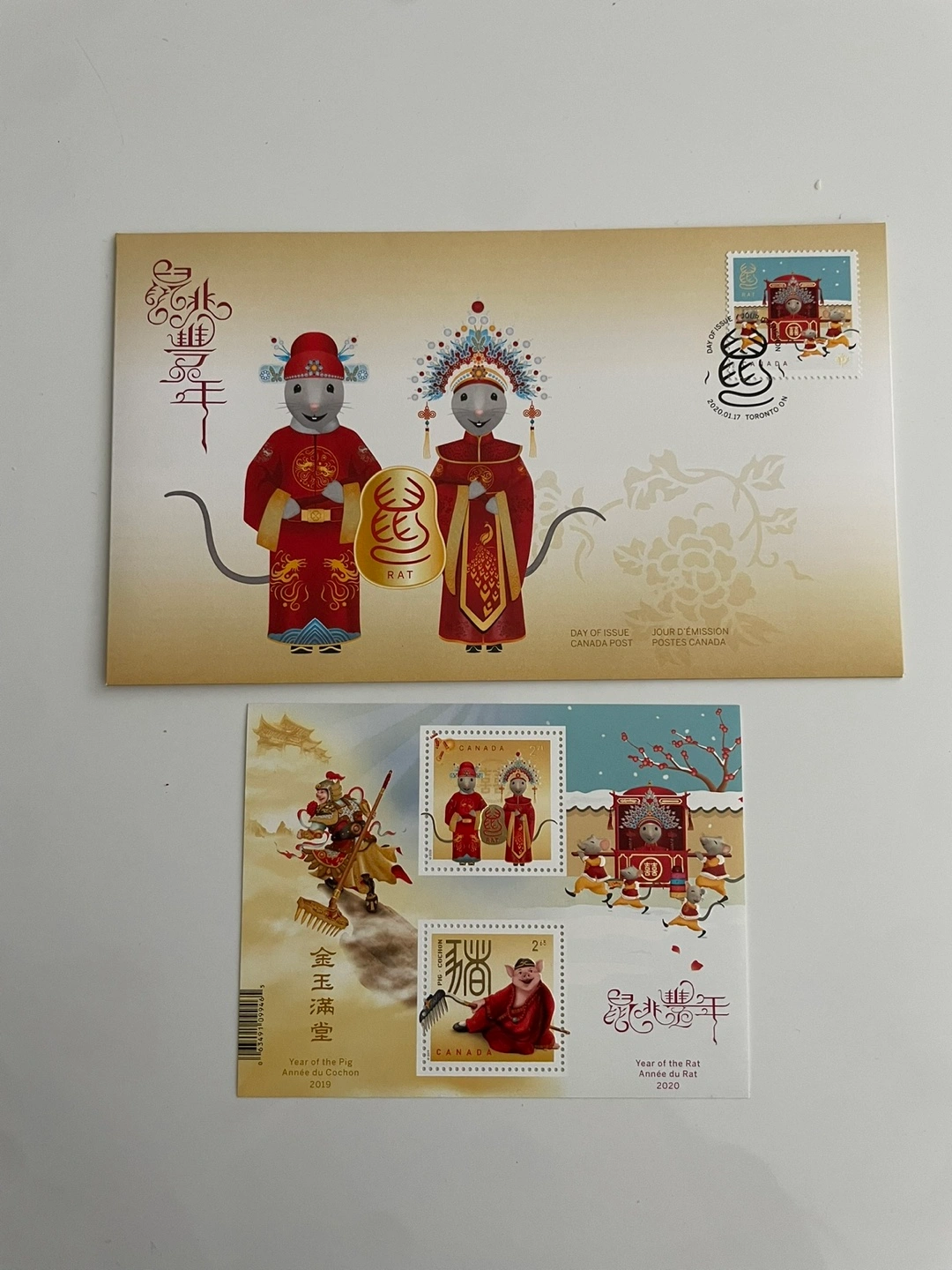 Selling Canada Post stamps commemorating the Year of the Rat. These are from the 2019 Year of the Pig and 2020 Year of the Rat series. Great for collectors or anyone interested in Canadian postal history!