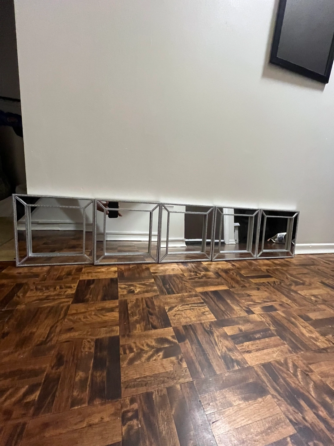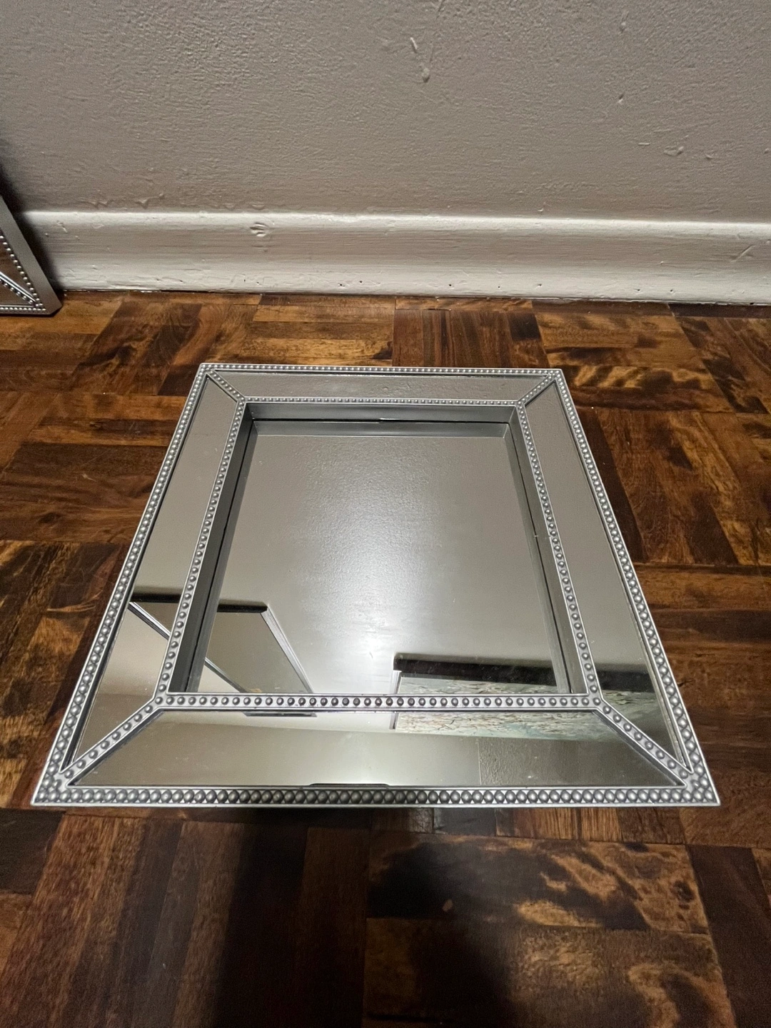Selling a square wall mirror with beaded detailing around the frame. It's in great condition and ready to add a touch of elegance to your space! The mirror is silver in colour and measures approximately 9.8 inches.