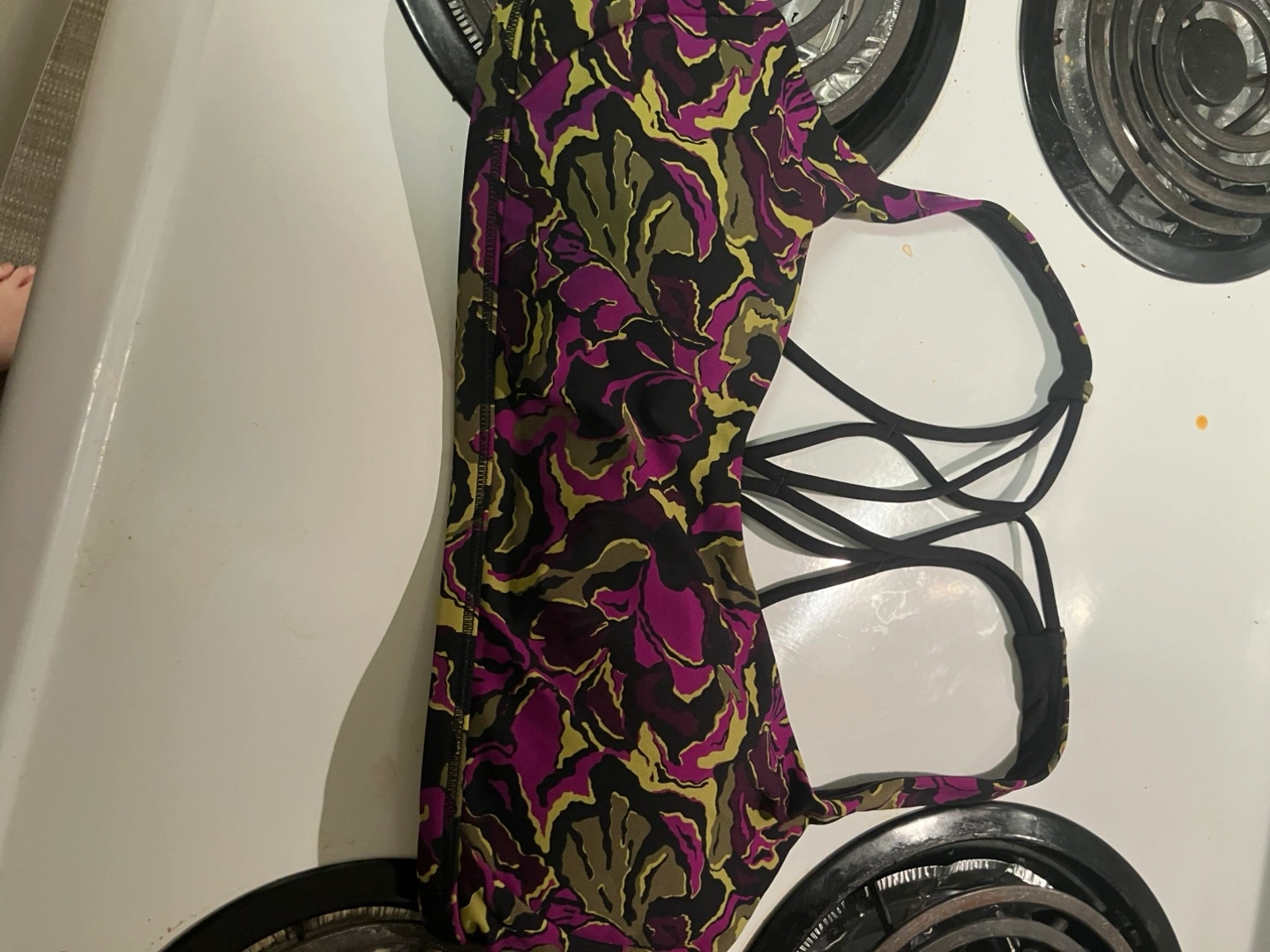 Selling a Lululemon workout top in size 8. It features a unique pattern with purple, olive, and black colours. The back has a strappy design. Great for yoga or any workout!