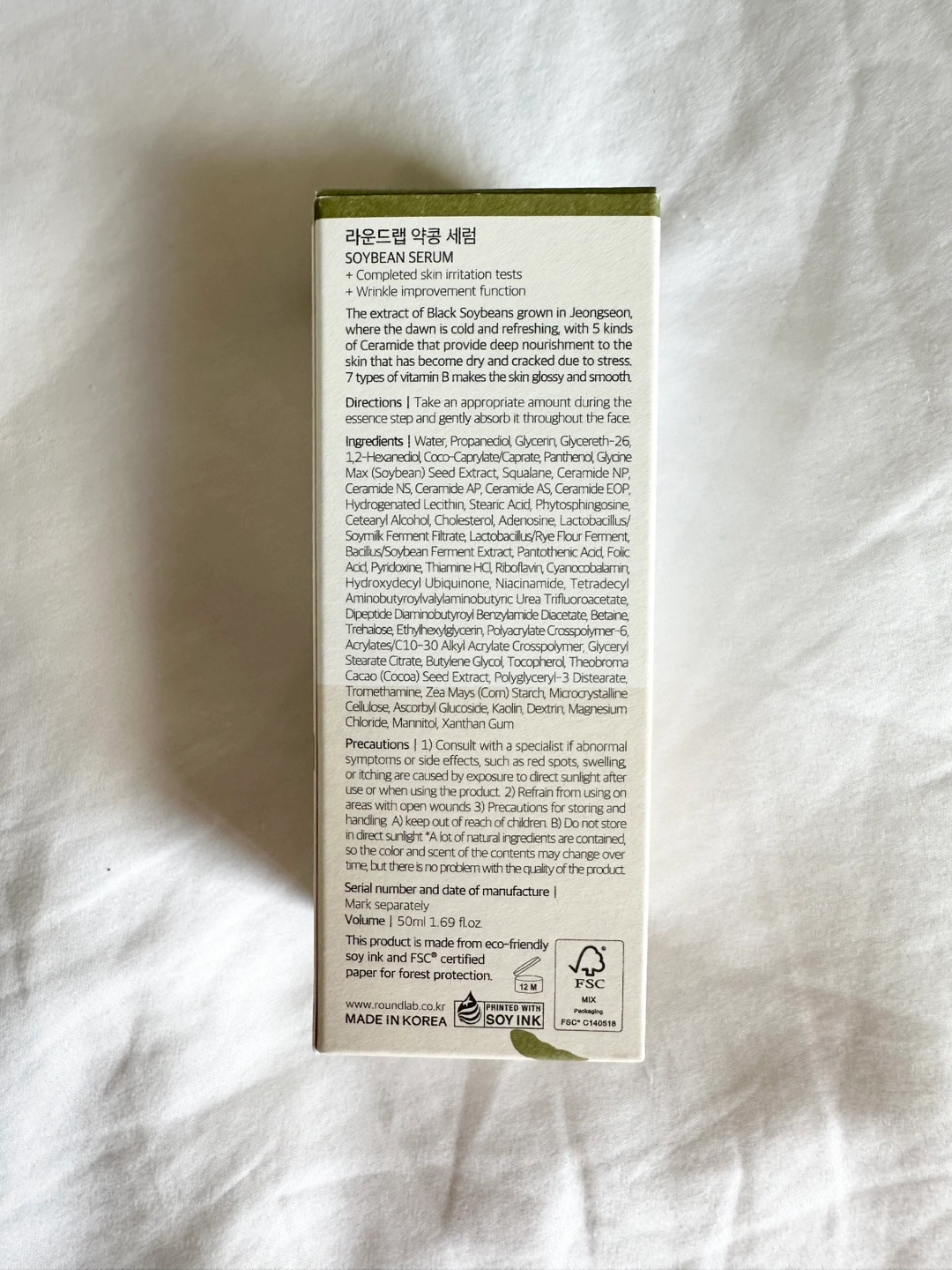 Unopened, brand new in box Round Lab Soybean Nourishing Serum. The extract of Black Soybean, grown in Jeongseon, is cold and refreshing, with 5 kinds of ceramide that provide deep nourishment to the skin. 7 types of vitamin B make the skin glossy and smooth. Full size 50 ml Expiry date: 2026 June 23