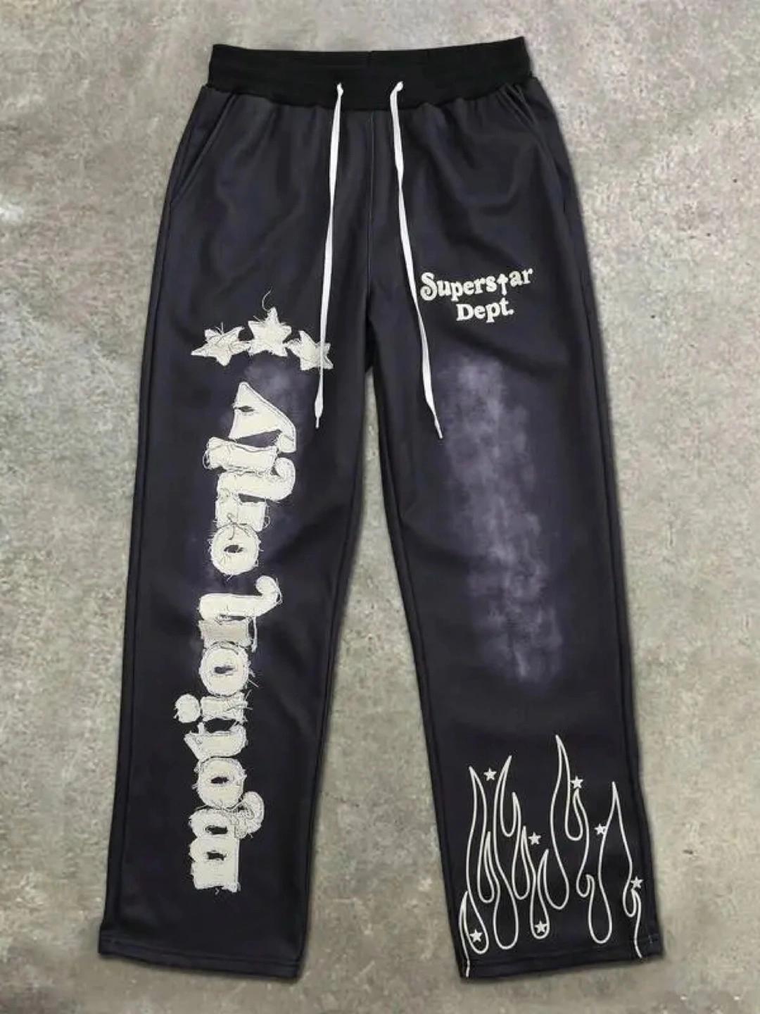 Cool black pants with Superstar Dept. and other graphic prints! These are perfect for adding a bit of edge to your wardrobe. They feature a comfortable elastic waistband with a drawstring. The material is soft and comfy, great for everyday wear!