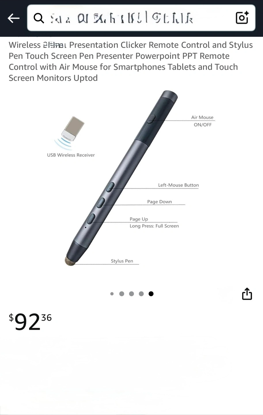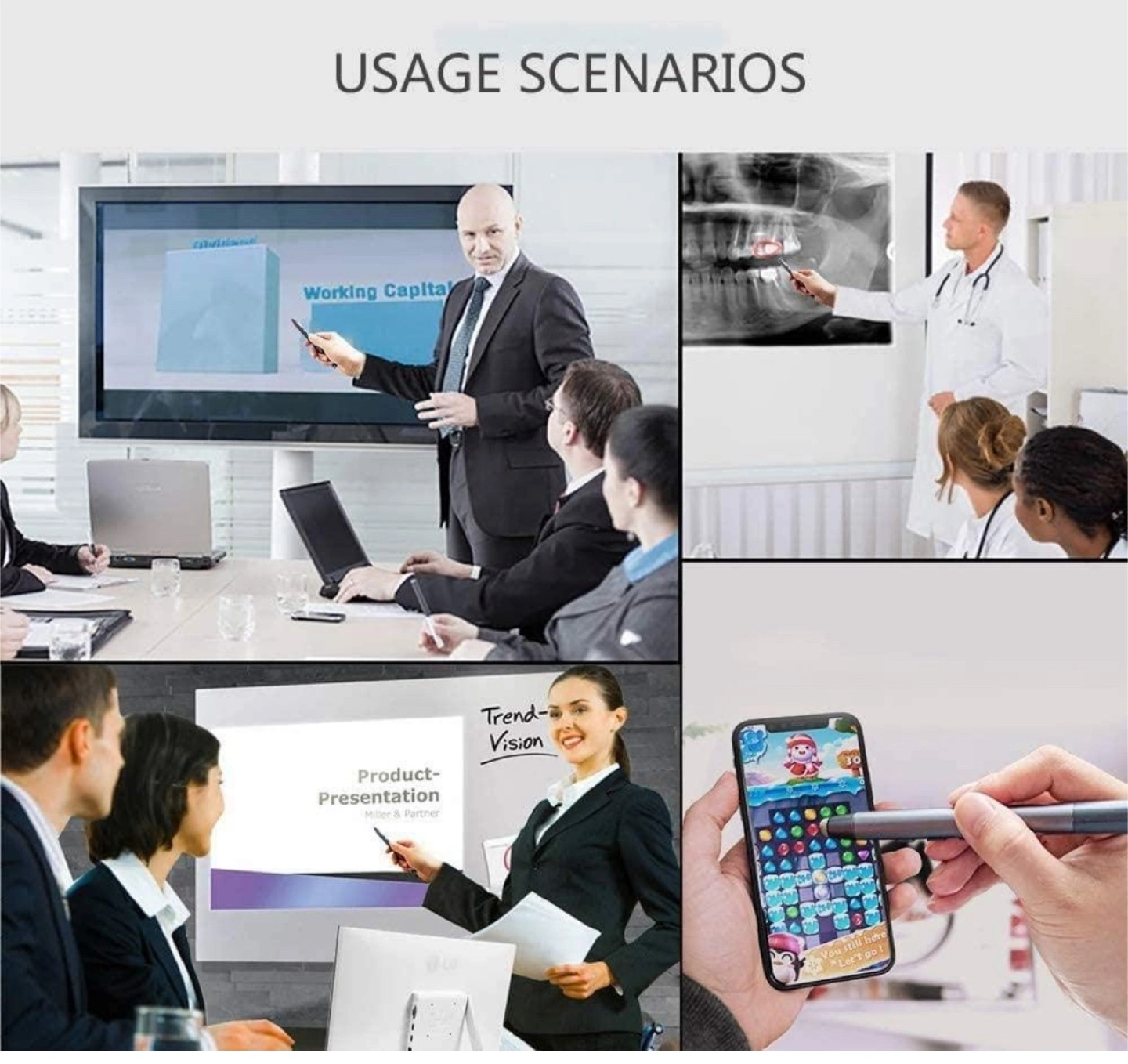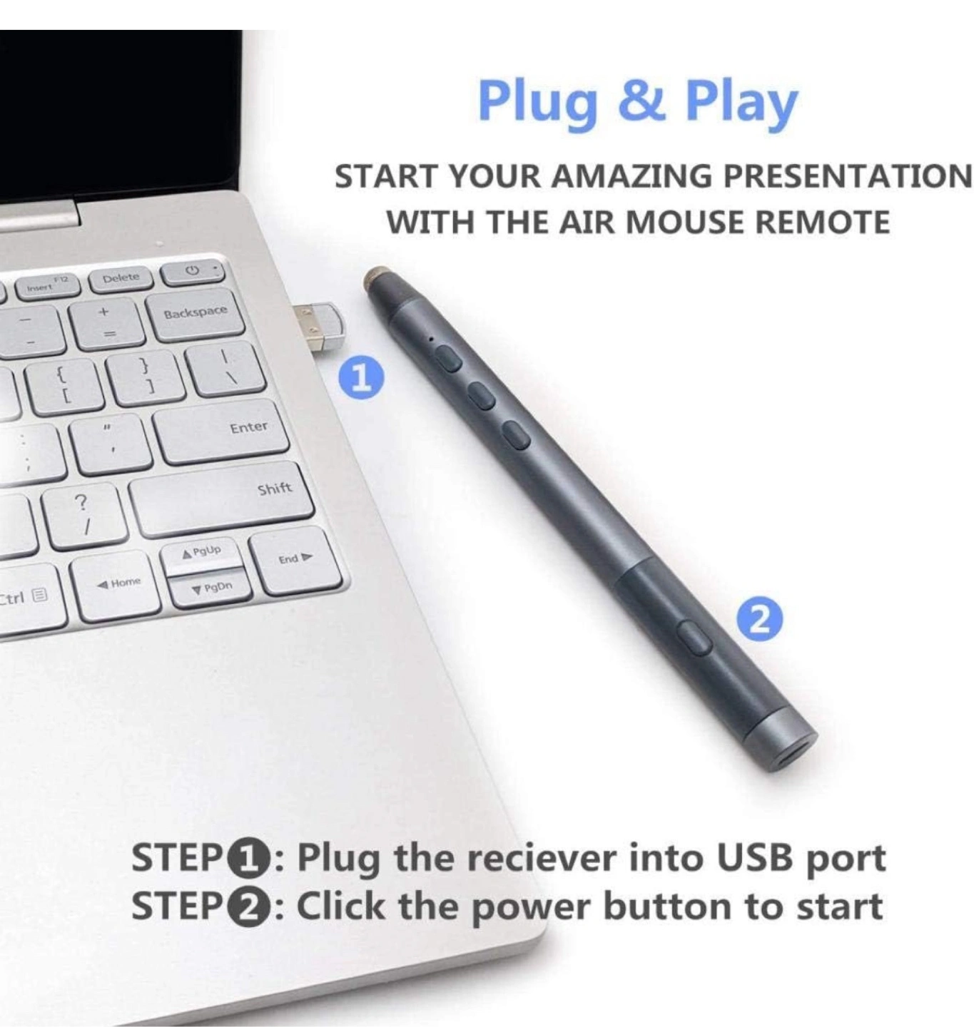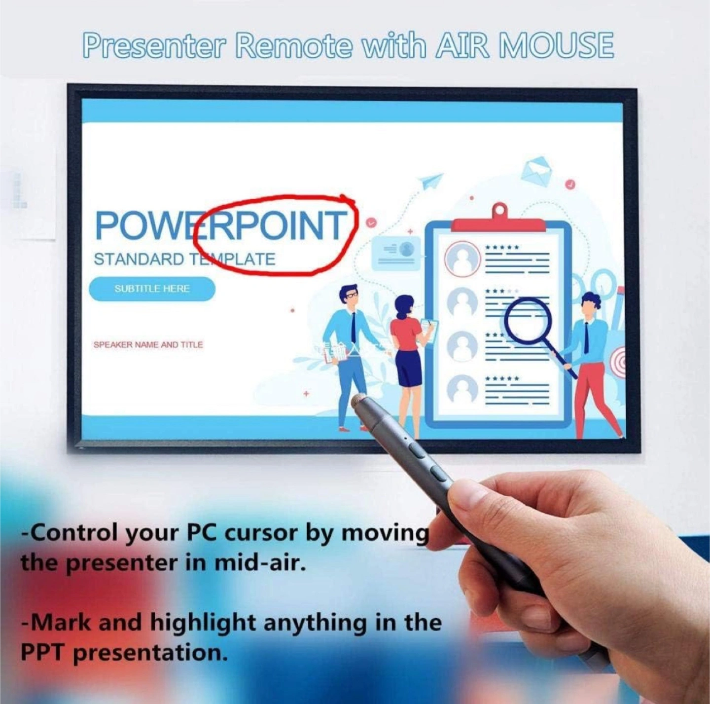 This is a stylus pen/touchscreen pen that can control your PC cursor by moving the presenter in mid-air. You can also mark and highlight anything in the PPT presentation! It has buttons for Air Mouse ON/OFF, Left-Mouse Button, Page Down, Page Up, and Long Press: Full Screen