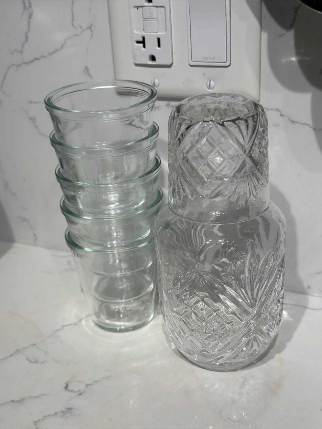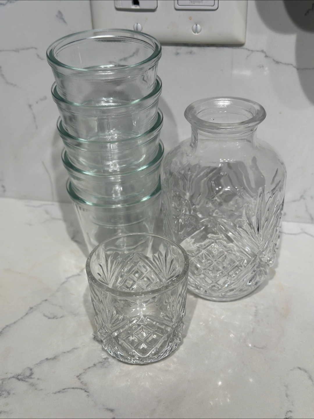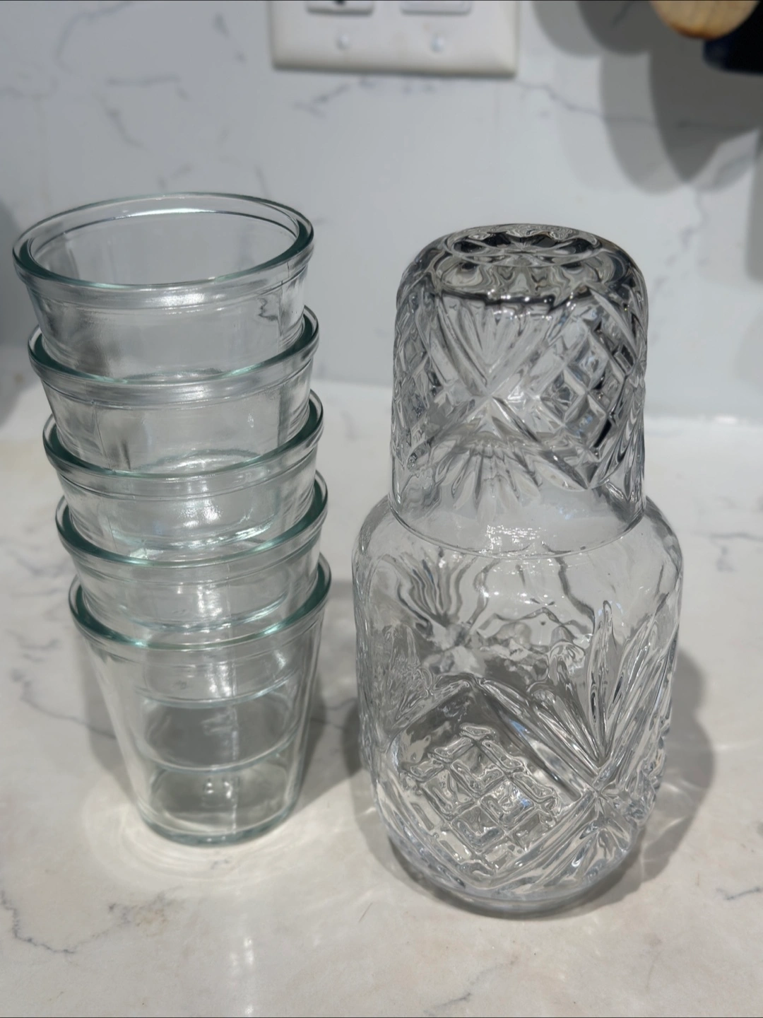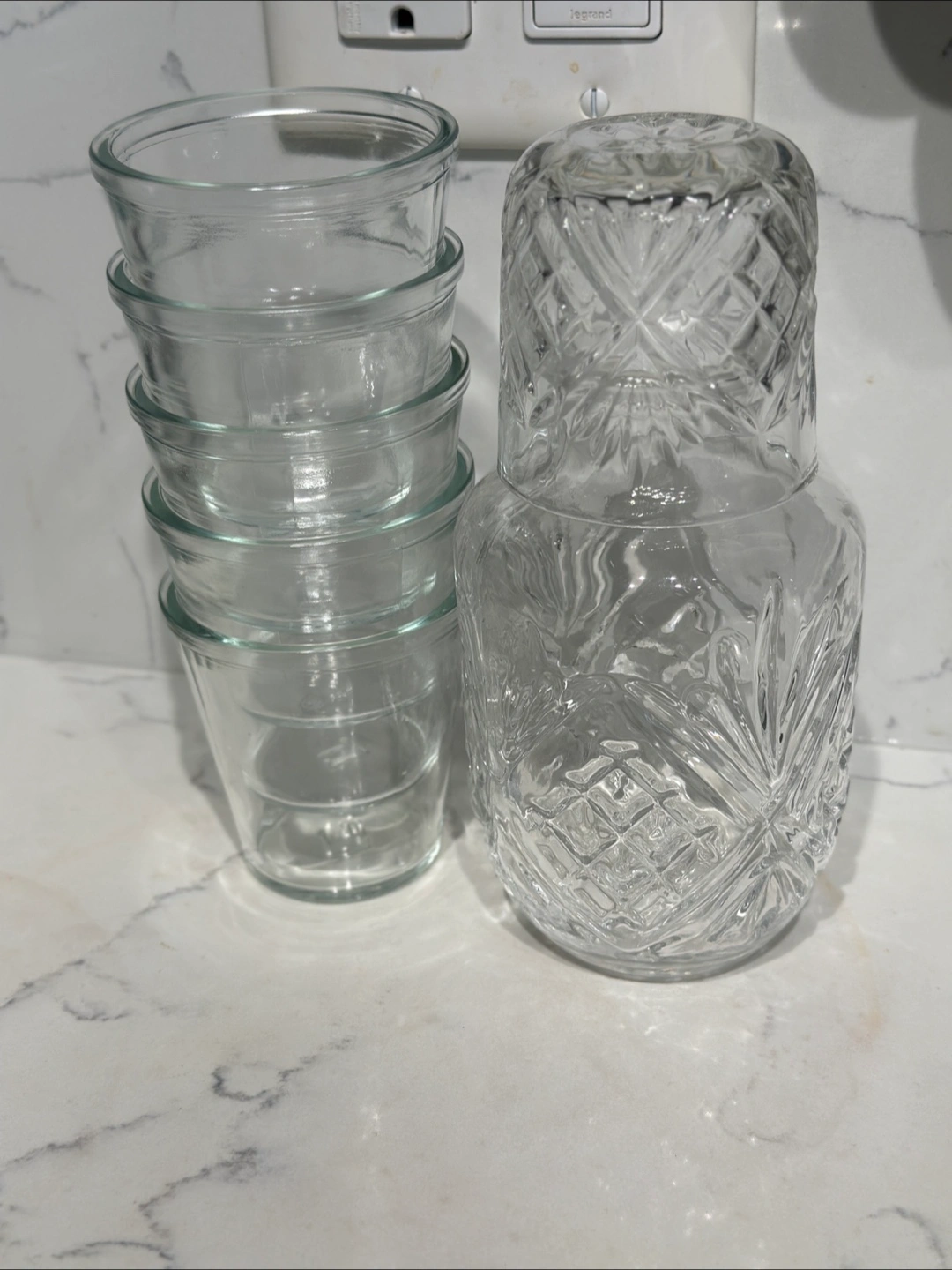 Crystal Bedside water carafe - looks like new/ never used. Ideal for storing water near bedside. Comes with a glass lid as well Selling a set of five small glass jars. They're in great condition and perfect for small storage or DIY projects