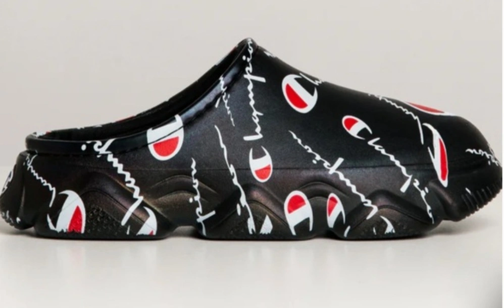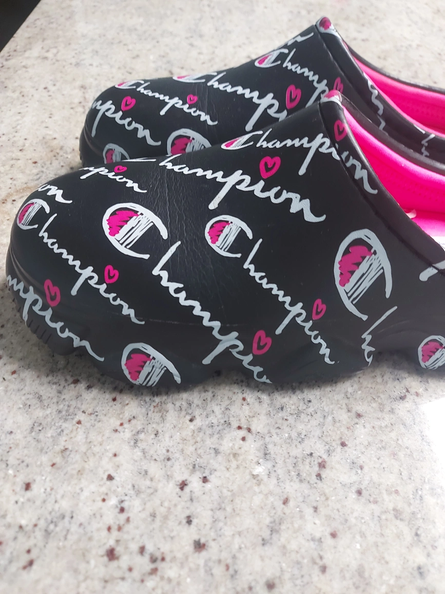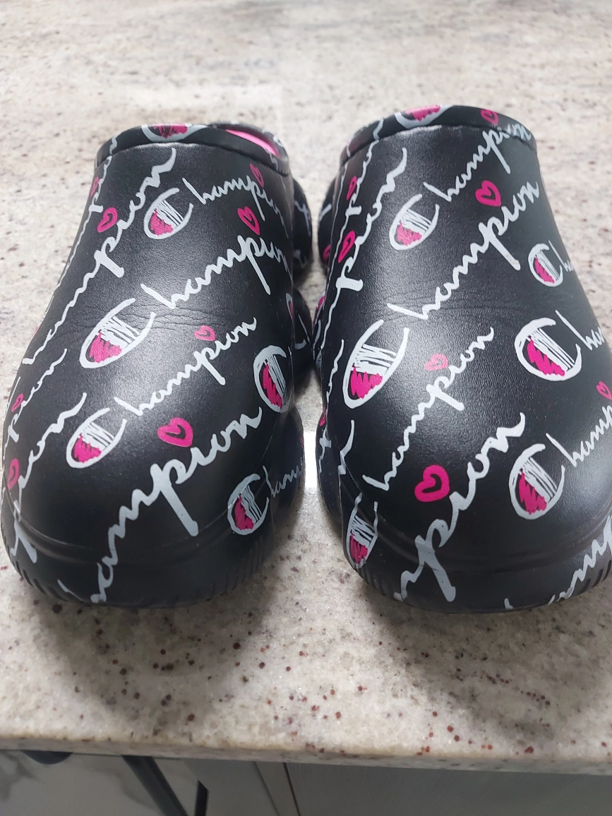 Cute Champion clogs in a size 9-10! They have a black background with the Champion logo and little pink hearts all over, once used, very light and comfy. Perfect for slipping on for quick errands or just lounging around.