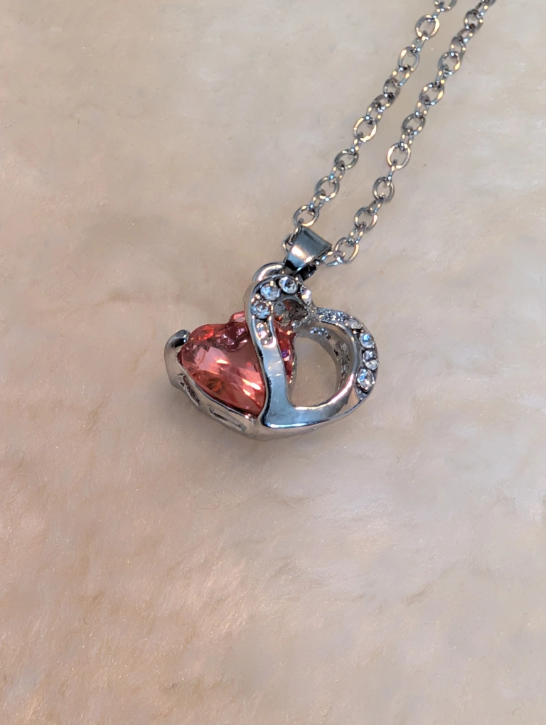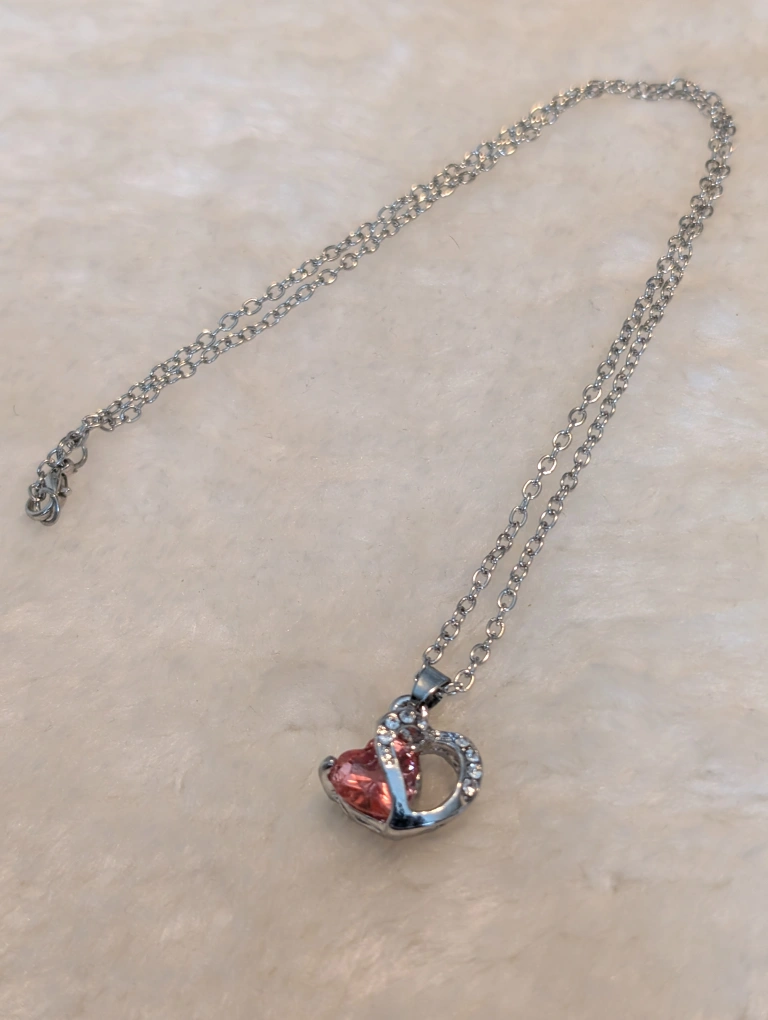 A beautiful heart pendant necklace is up for grabs! The pendant features a lovely peach-coloured stone surrounded by sparkling accents, set in a silver-tone metal. It's a charming piece to add a touch of elegance to any outfit