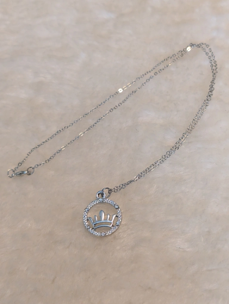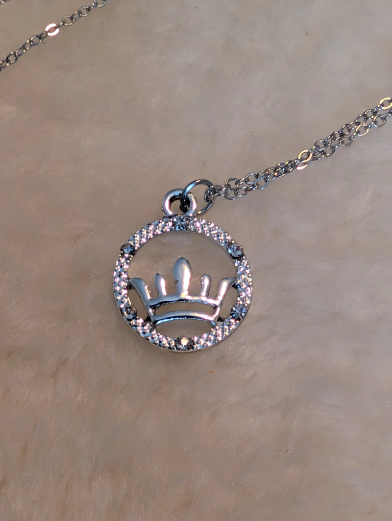 A cute silver color tone necklace with a crown pendant! The pendant is a circle with a crown inside, surrounded by little gems. It's in great condition and would be a lovely addition to any outfit
