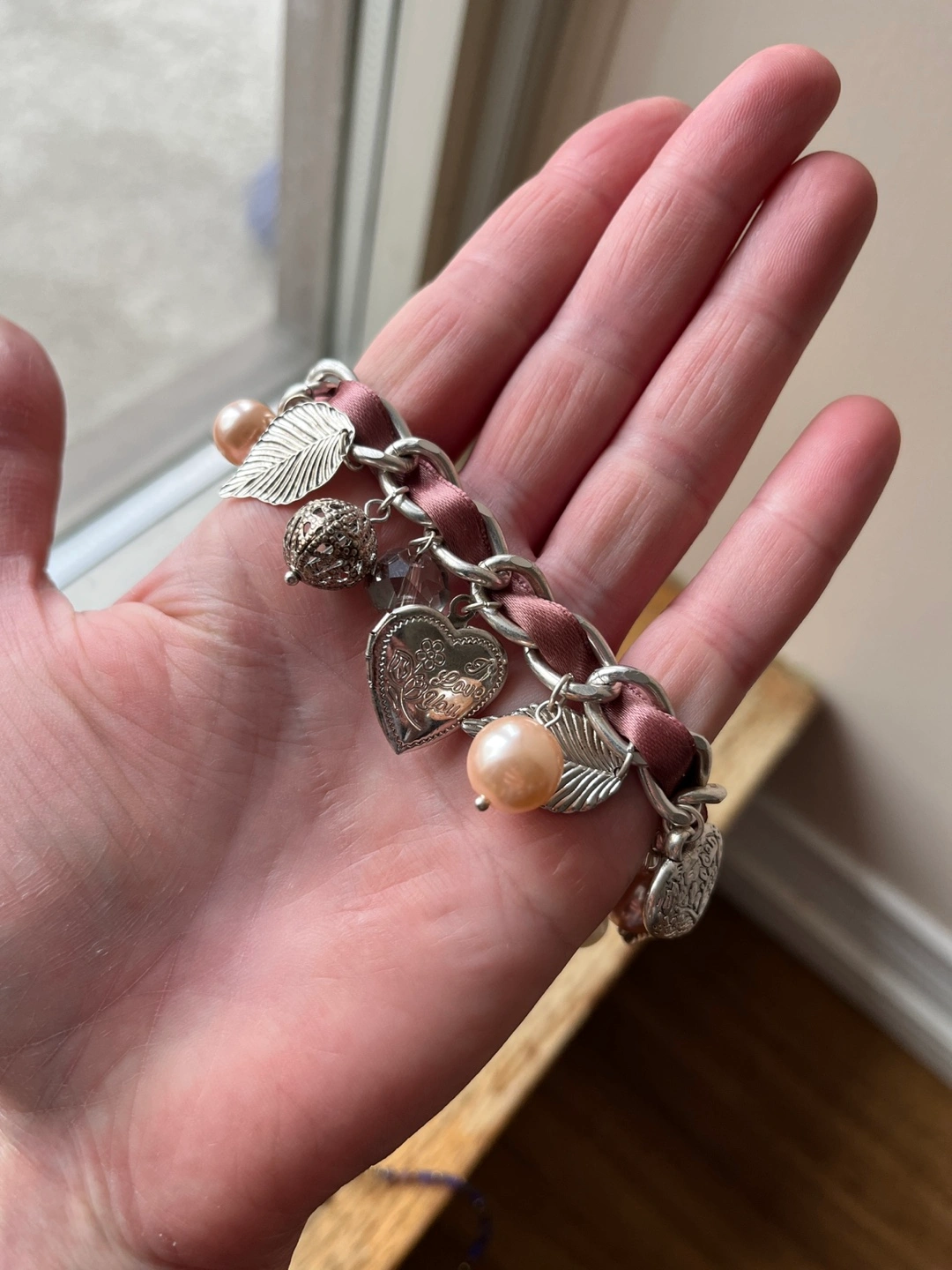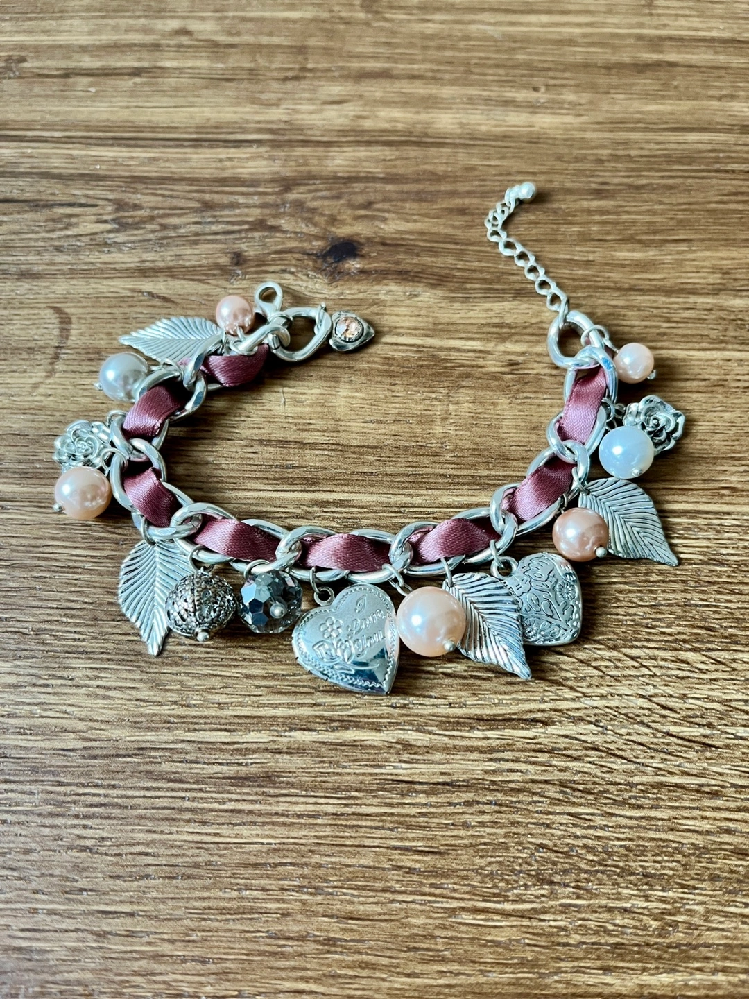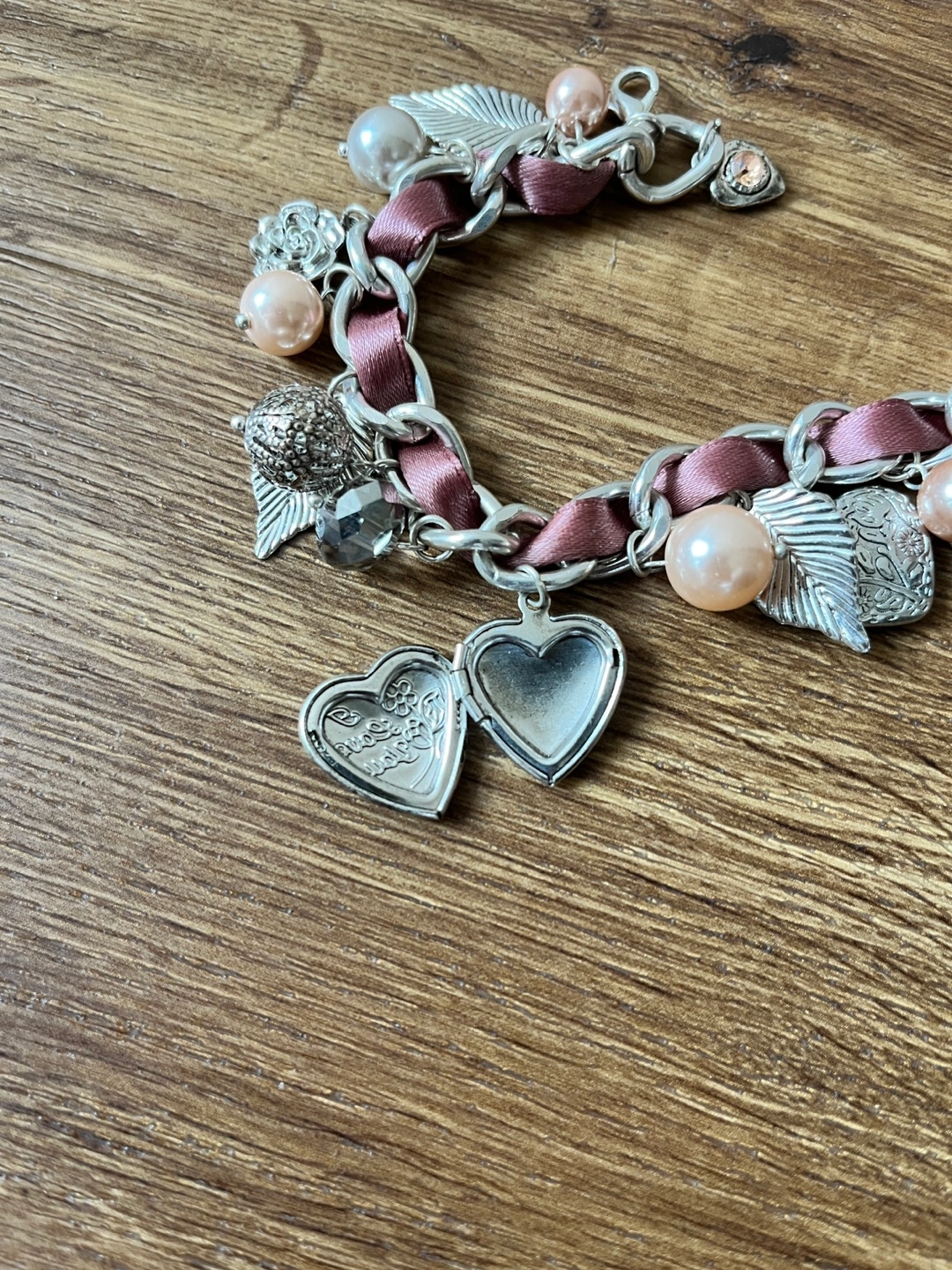 Selling a cute charm bracelet! It features a mix of silver-toned charms, including leaves, pearls, and a heart-shaped locket. The chain is interwoven with a mauve-coloured ribbon. A sweet accessory to add a little sparkle to your day. Never worn.