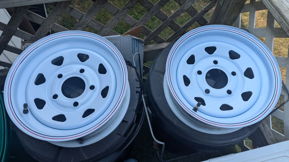 Selling a G1&W trailer wheel rim. It's a 12x4JJA size. The rim has a white finish with red and black stripes. Ready to go for your trailer needs! Got new tires but didn't need these rims they came with. 60 for both.