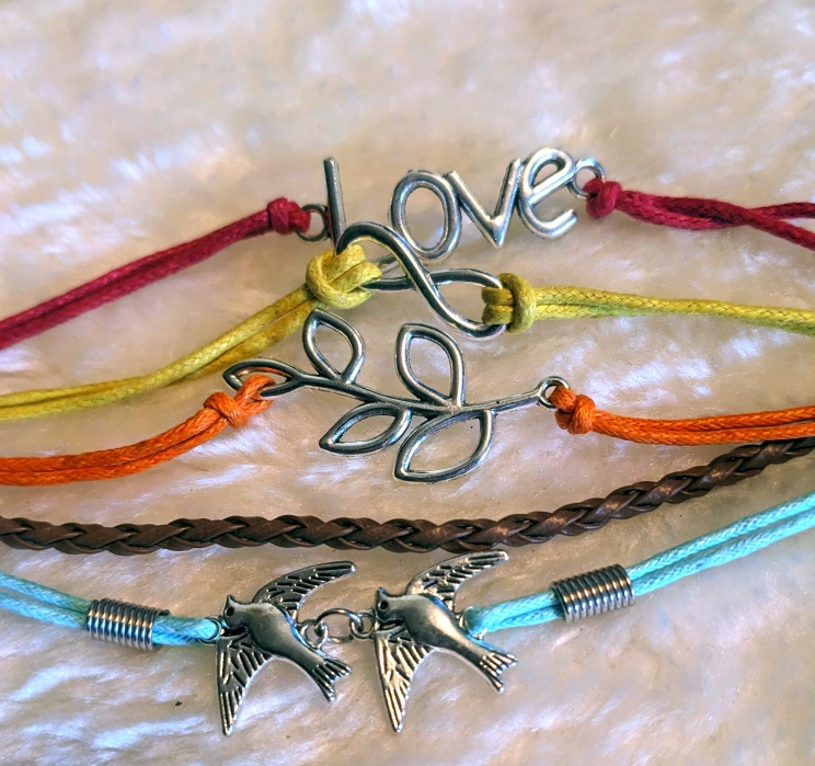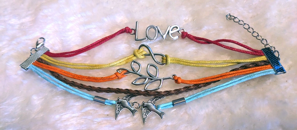 Selling a set of 4 cute charm bracelet. They feature different charms, including a 'love' charm, an infinity symbol, a leaf, and two birds. The bracelets have adjustable closures, so they should fit most wrists. Perfect for adding a little something extra to your outfit