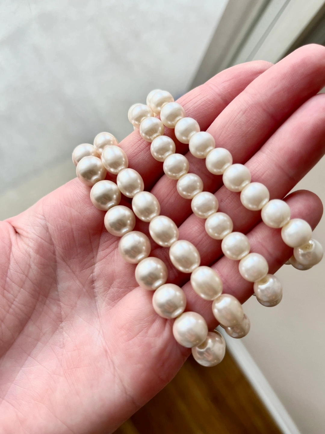 Pearl bracelets (not real pearls), perfect for adding a touch of elegance to any outfit. They are all slightly different. The bracelets have a beautiful lustre and are in great condition. A timeless accessory that can be dressed up or down!