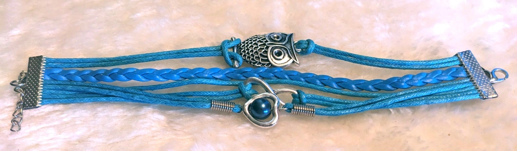 This cute bracelet features multiple strands in a bright blue colour. It has an owl charm and a heart charm with a dark blue pearl accent. It's in great condition and would add a pop of colour to any outfit