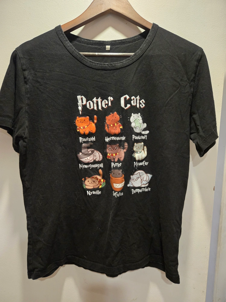 Potter Cats Black T-Shirt Cute black t-shirt with a 'Potter Cats' design! It features cartoon cats dressed as Harry Potter characters like 'Rawnald', 'Hermewnie', and 'Pawdamort'. A fun and unique piece for any Potterhead or cat lover