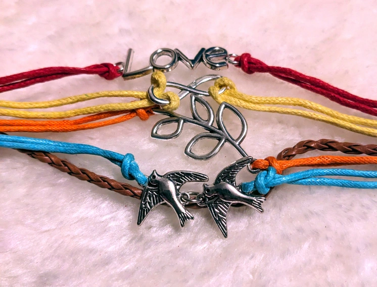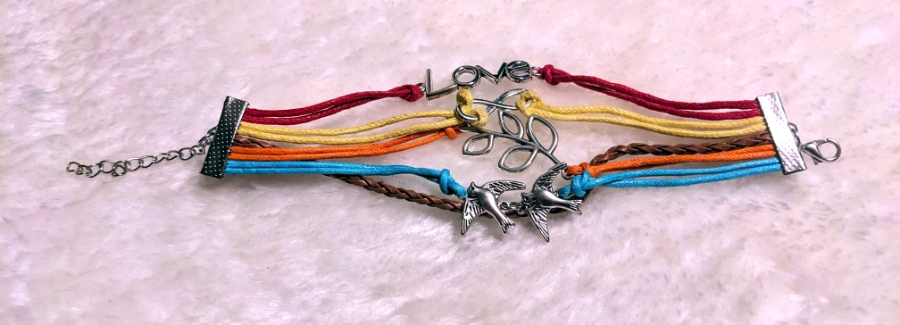 This is a cute multi-strand bracelet with different coloured strands. It has a silver-coloured leaf, two bird charms, and the word 'love' as charms. It's in great condition and would make a lovely addition to any outfit!