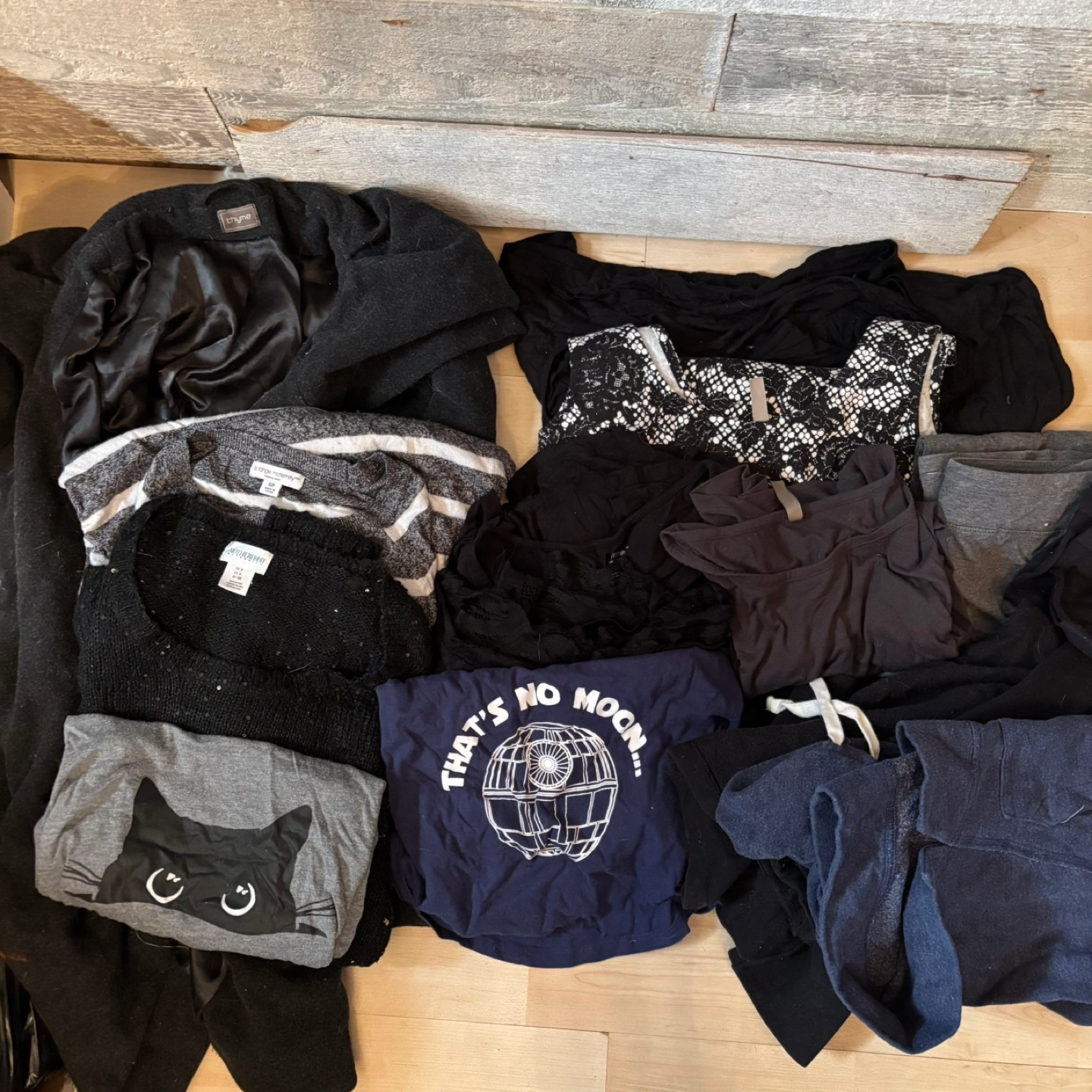 Selling a mixed lot of women's maternity clothing. Includes one jacket, two sweaters, one pair of leggings, two dresses, a belly band, two sweatshirts, and a few other tops Sizes small/medium