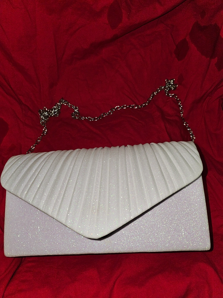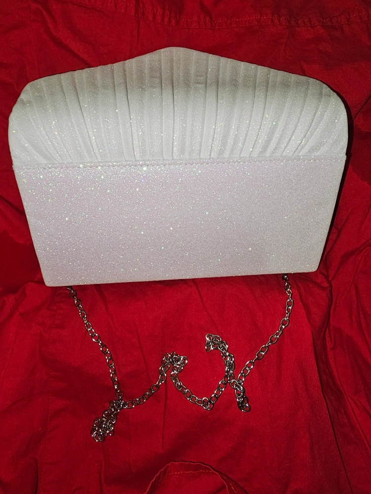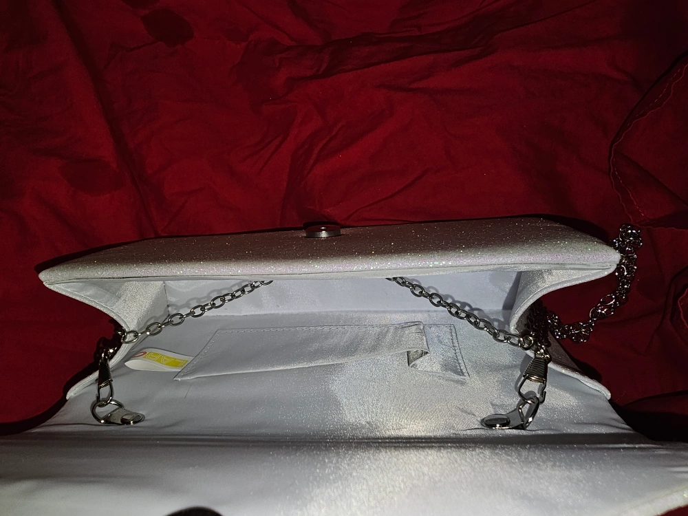 Here's a cute white glitter clutch with a chain strap! It's in great condition and ready for a night out or special occasion. The chain strap is detachable, so you can carry it as a clutch or wear it as a shoulder bag. It's the perfect size for your phone, wallet, and keys