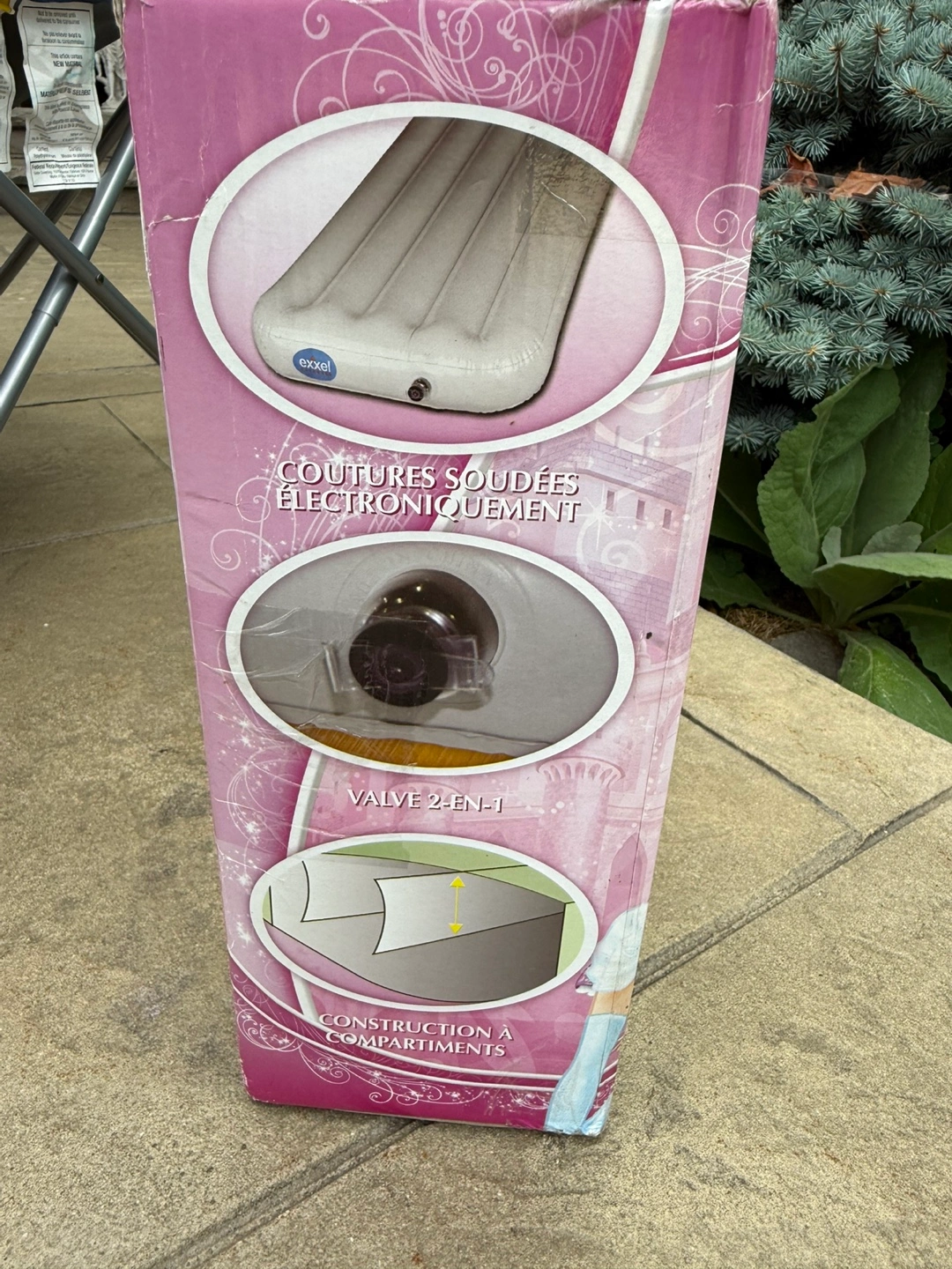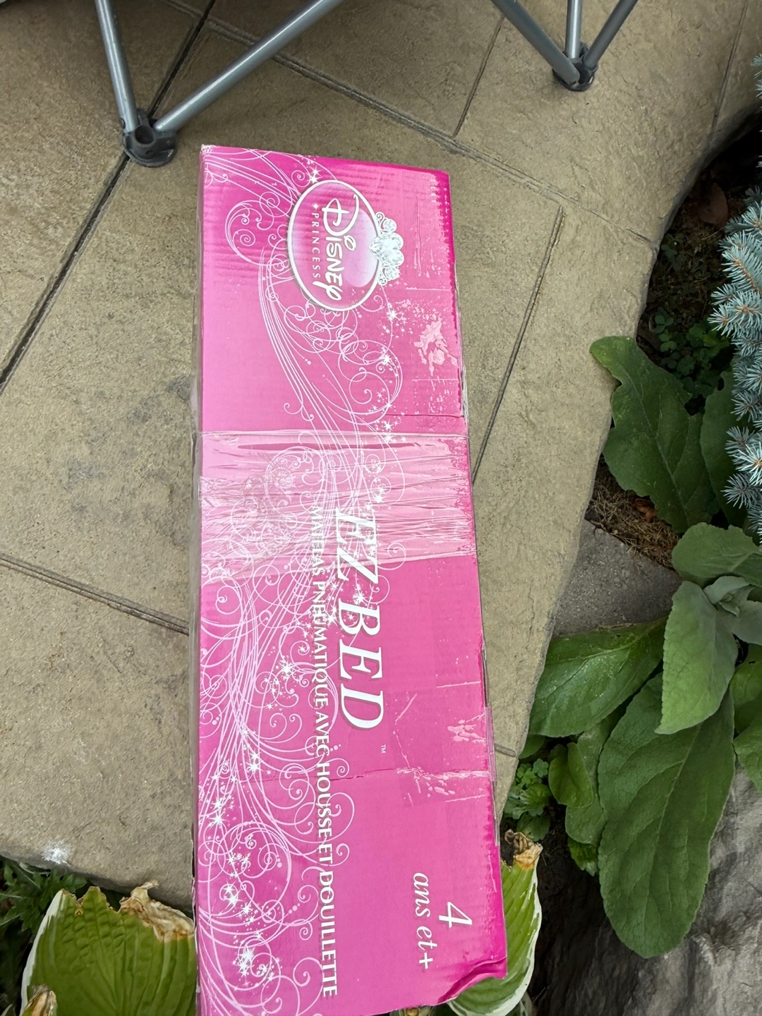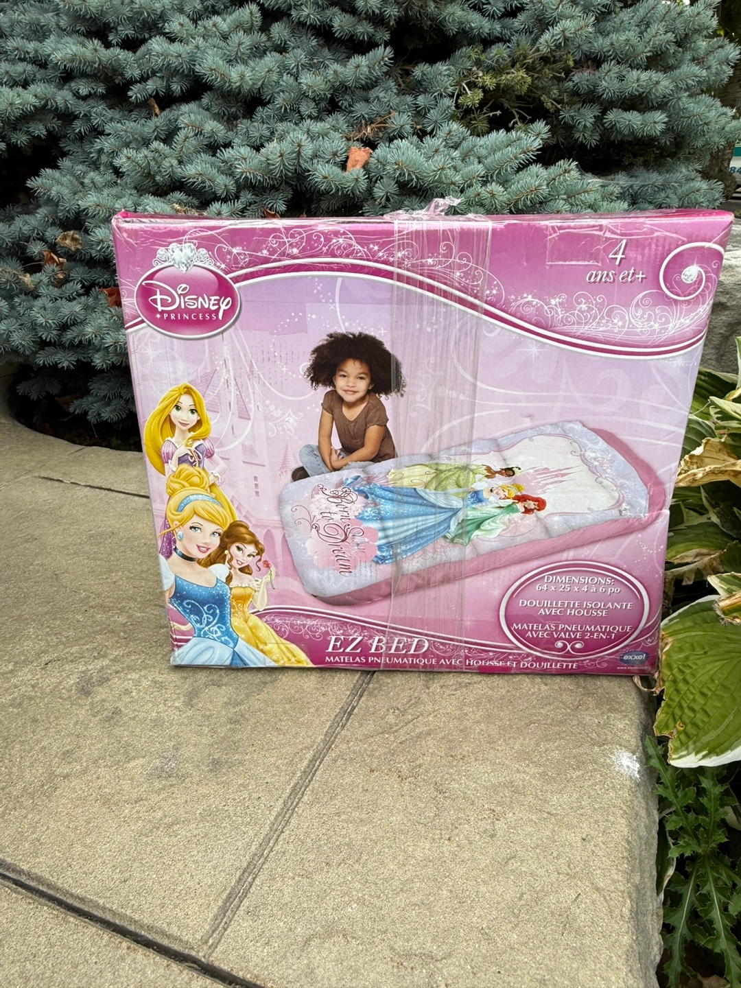 Selling a Disney Princess Ez Bed, perfect for kids aged 4 and up! It's an inflatable mattress with a soft cover, and the box shows the dimensions as being double the height when inflated. Great for sleepovers or travel