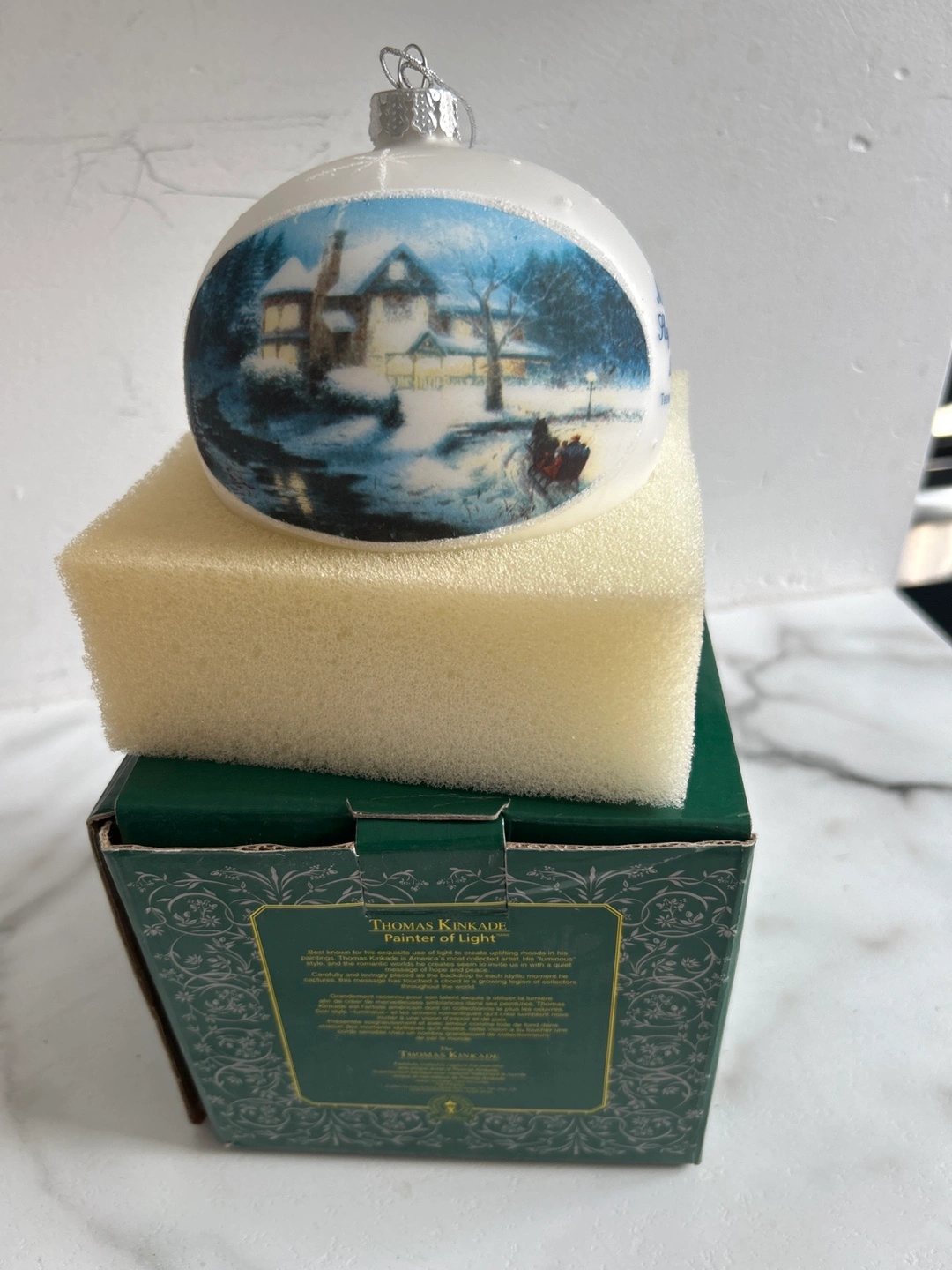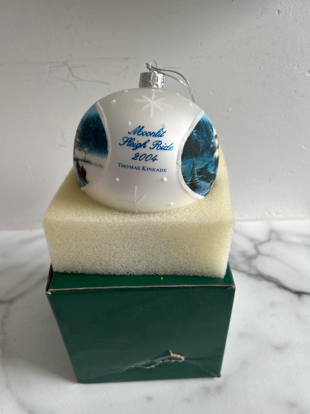 Selling a Thomas Kinkade 'Moonlit Sleigh Ride' ornament from 2004. It comes in its original box. A beautiful addition to any Christmas tree! Pick up in Elmwood
