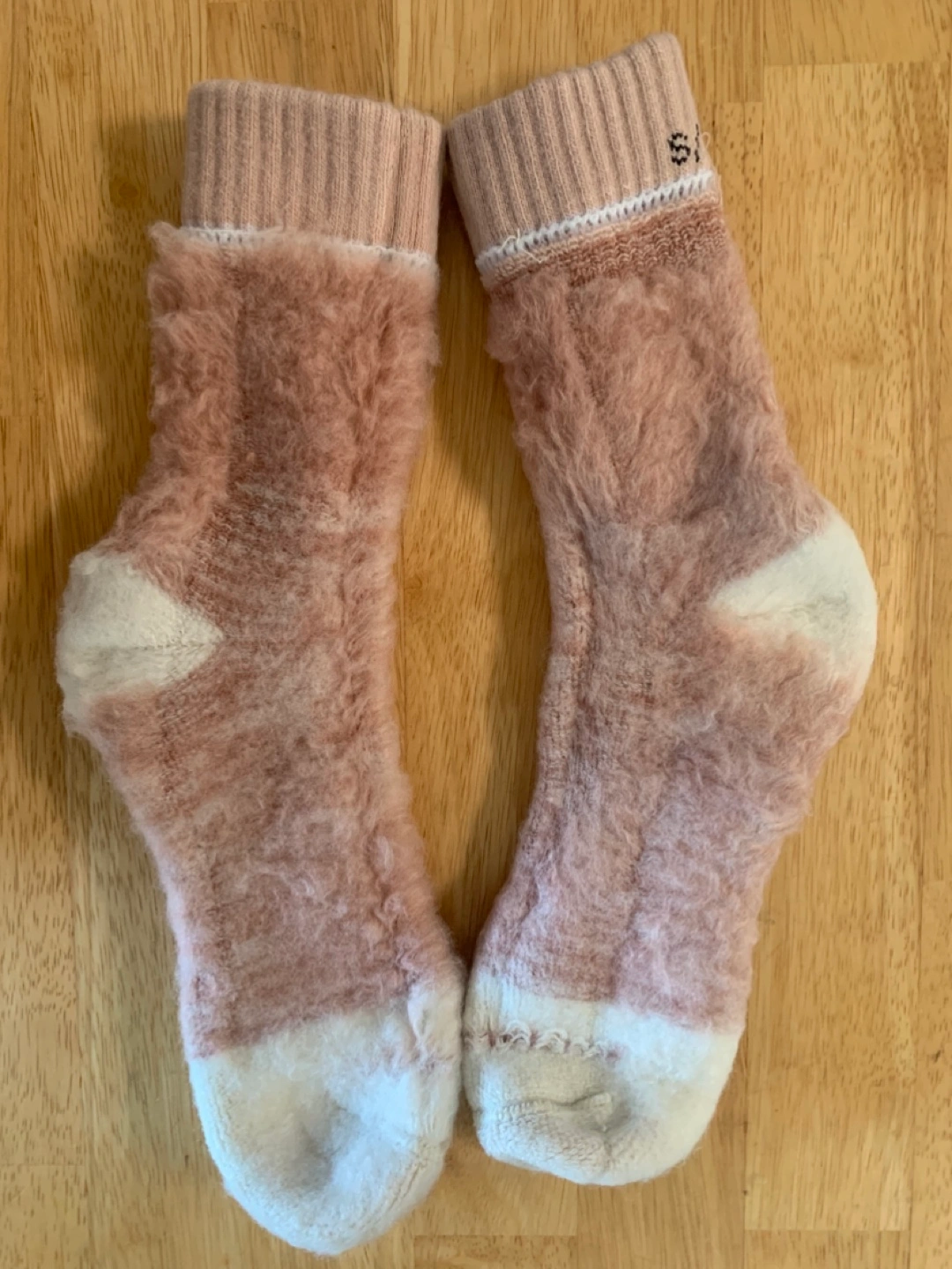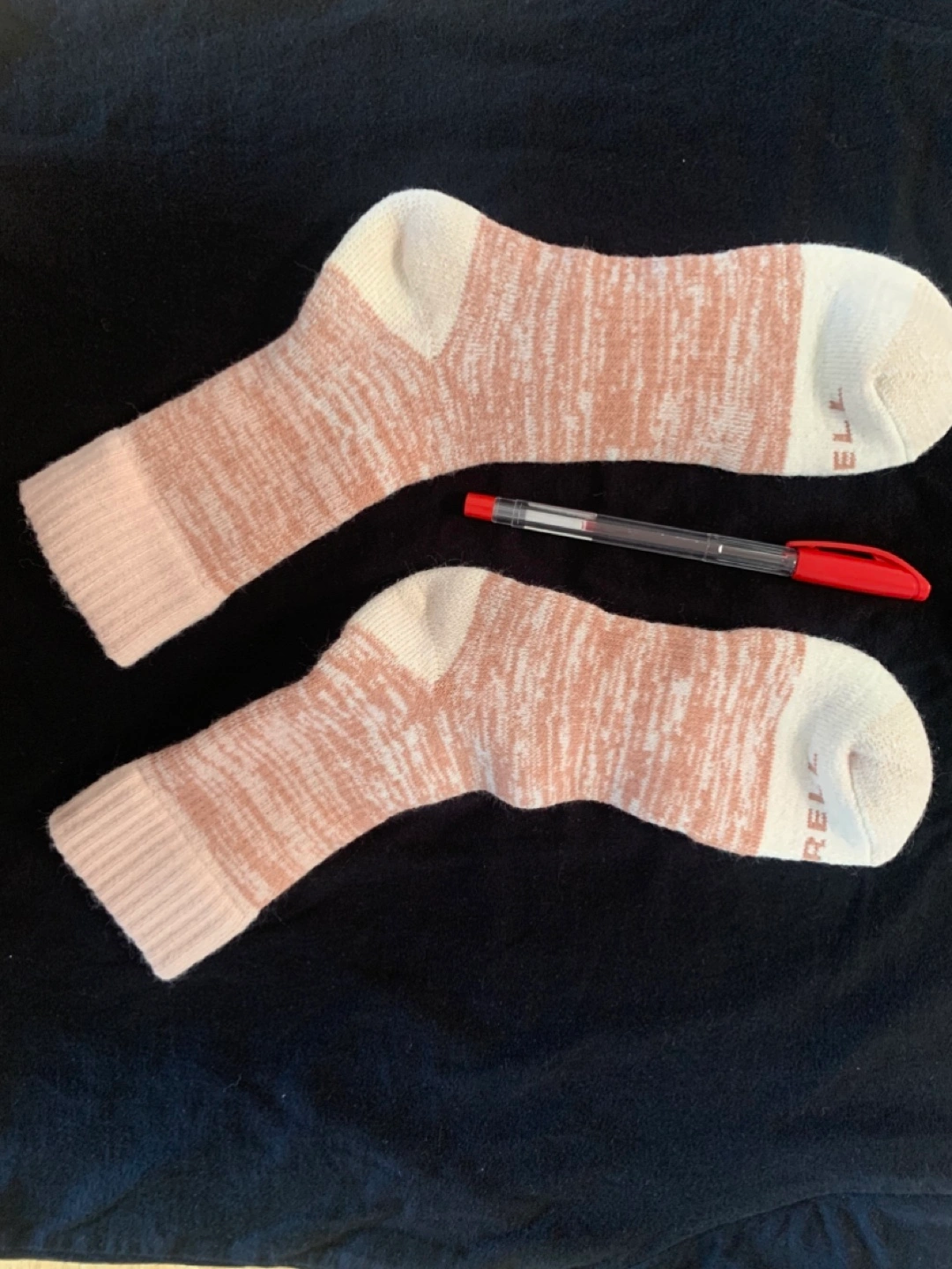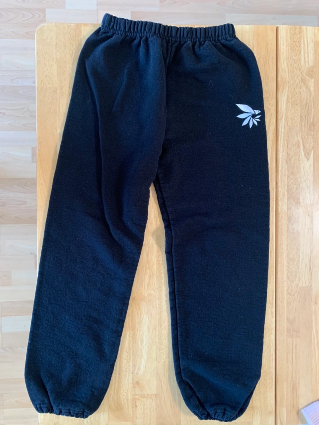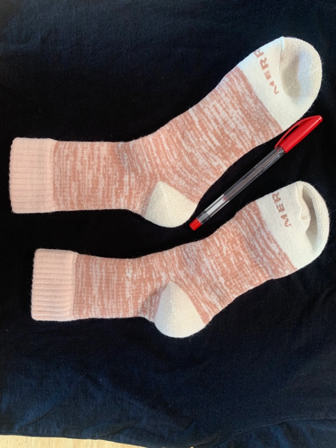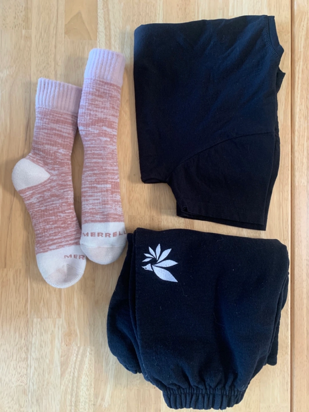 Selling a pair of new Merrell socks and a pair of black sweatpants. The socks are a light pink colour with white accents. The sweatpants are black with a white logo. V5T 0J5