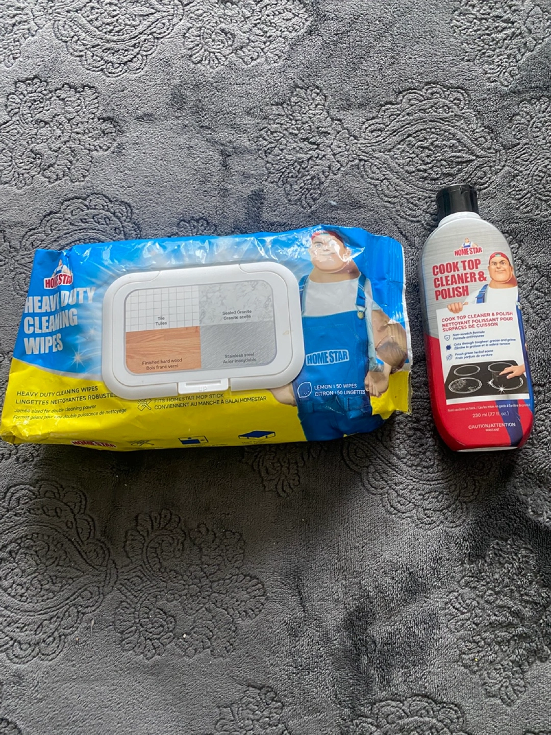 Selling a pack of Home Star Heavy Duty Cleaning Wipes and Cook Top Cleaner & Polish. The wipes are lemon scented and come with 50 wipes. The cooktop cleaner is 230 ml. Great for keeping your kitchen surfaces sparkling!