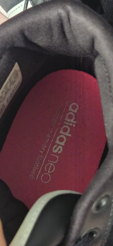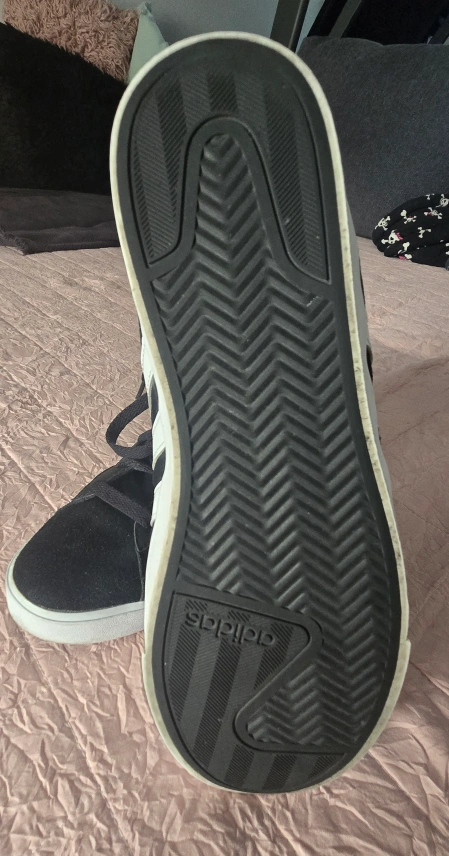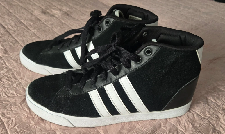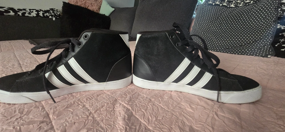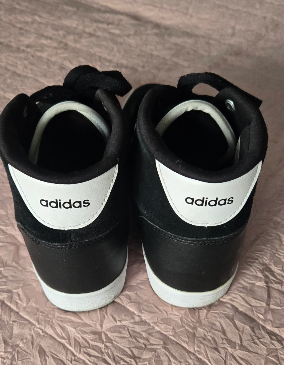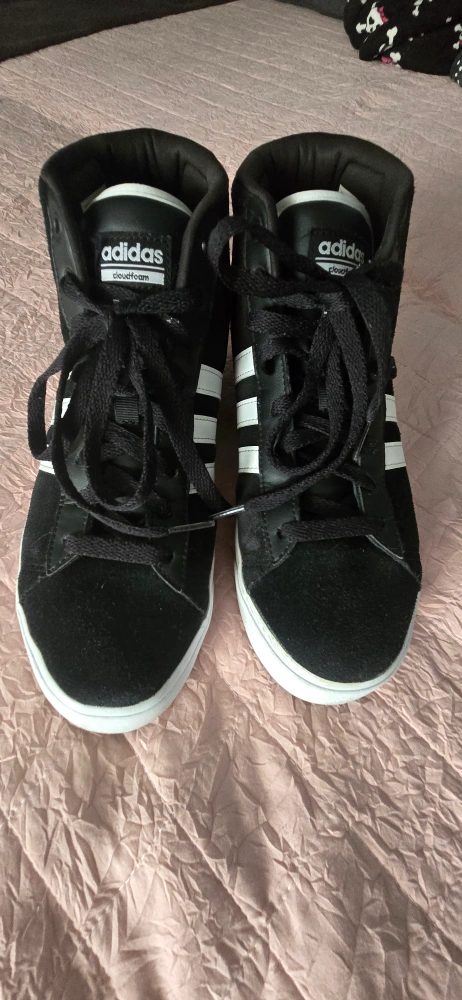 Selling a pair of Adidas Cloudfoam high top sneakers. They're black with the classic three white stripes. The soles are in great shape, and they're super comfy thanks to the Cloudfoam technology!
