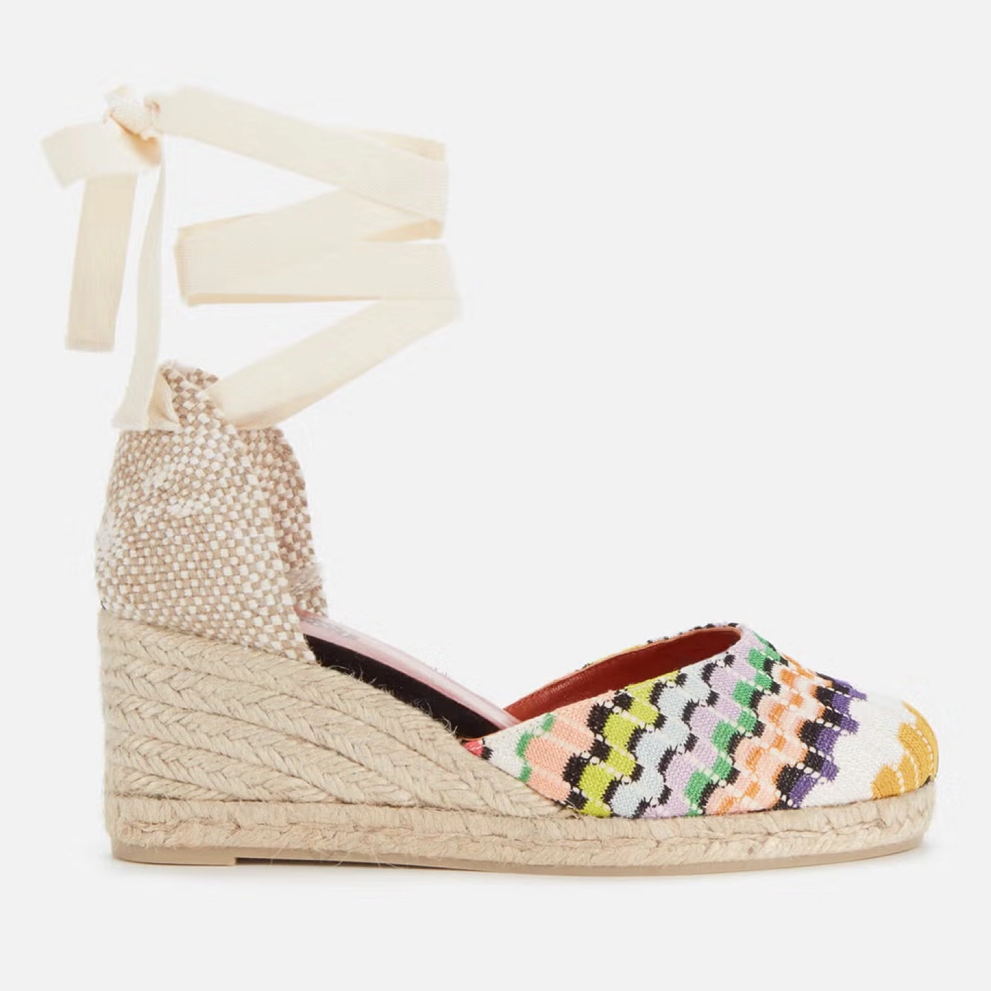 Missoni Round toe Lace up Designed in collaboration with Missoni Woven multi-colored fabric wave detailing at vamp Woven fabric detailing at heel Braided jute detailing at toe and sole edge Cutout detail at heel wrapped wedge heel Fabric upper, leather lining, rubber sole Made in Spain