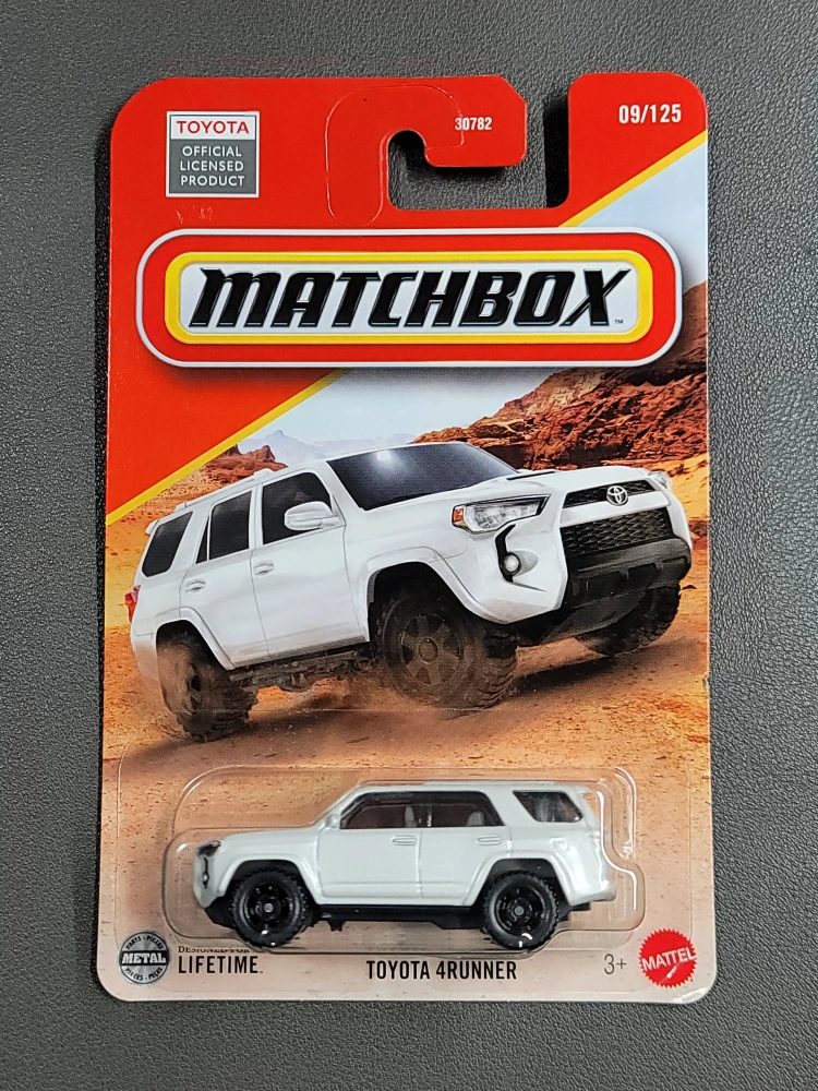Selling a Matchbox Toyota 4Runner diecast car still in its original packaging! It's part of the Matchbox series and is a detailed replica of the real Toyota 4Runner. Perfect for collectors or kids aged 3+