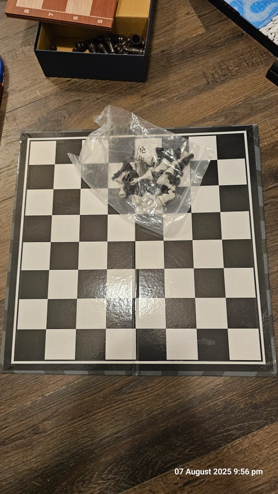 Selling a complete chess set! It comes with all the pieces, still in their original packaging, and a folding chessboard, making it easy to store and bring along for games with friends More info available upon request
