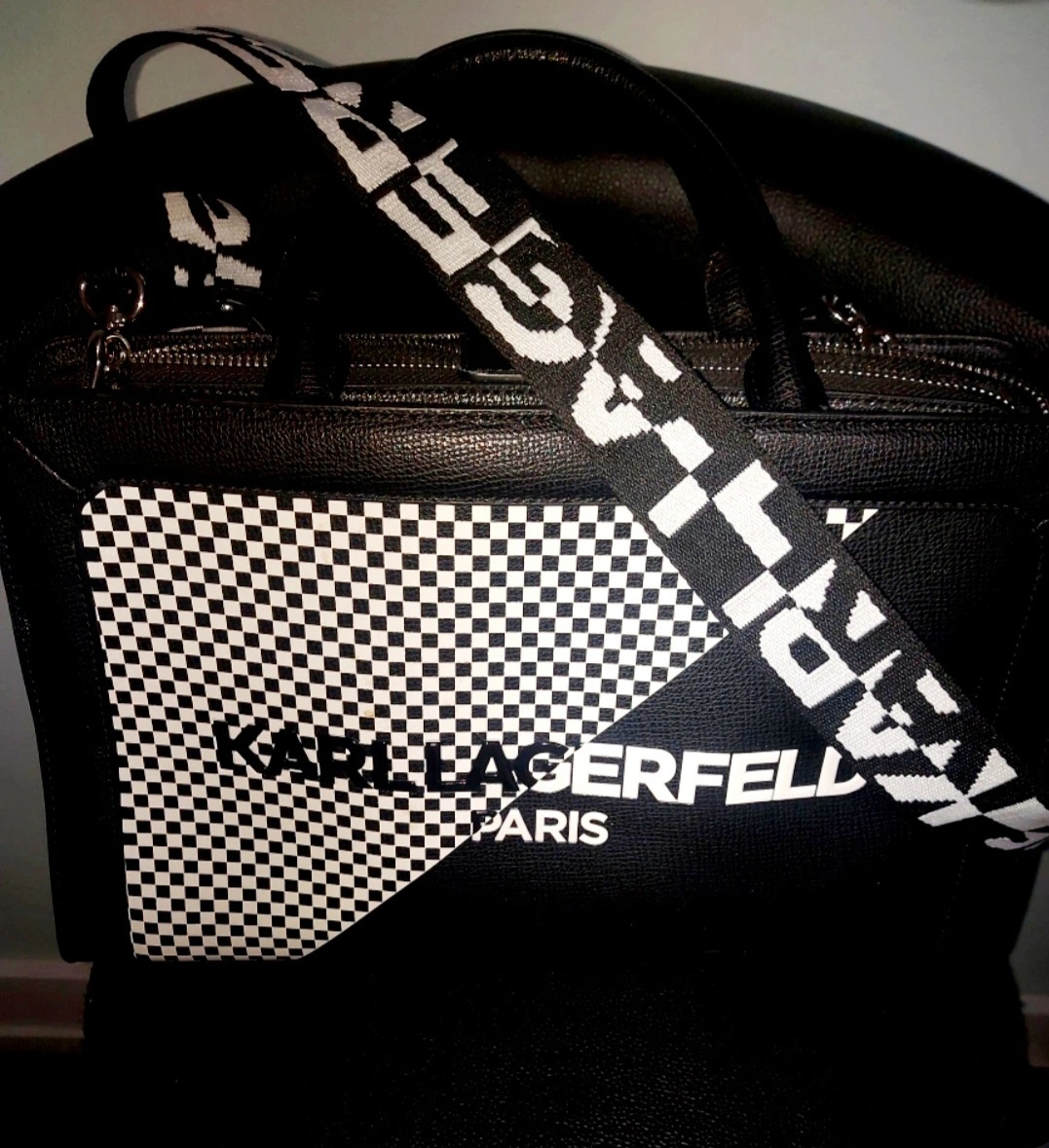 Check out this stylish Karl Lagerfeld Paris satchel! It features a cool black and white checkered design. The strap has the KARL LAGERFELD logo on it. Perfect for adding a touch of chic to any outfit.