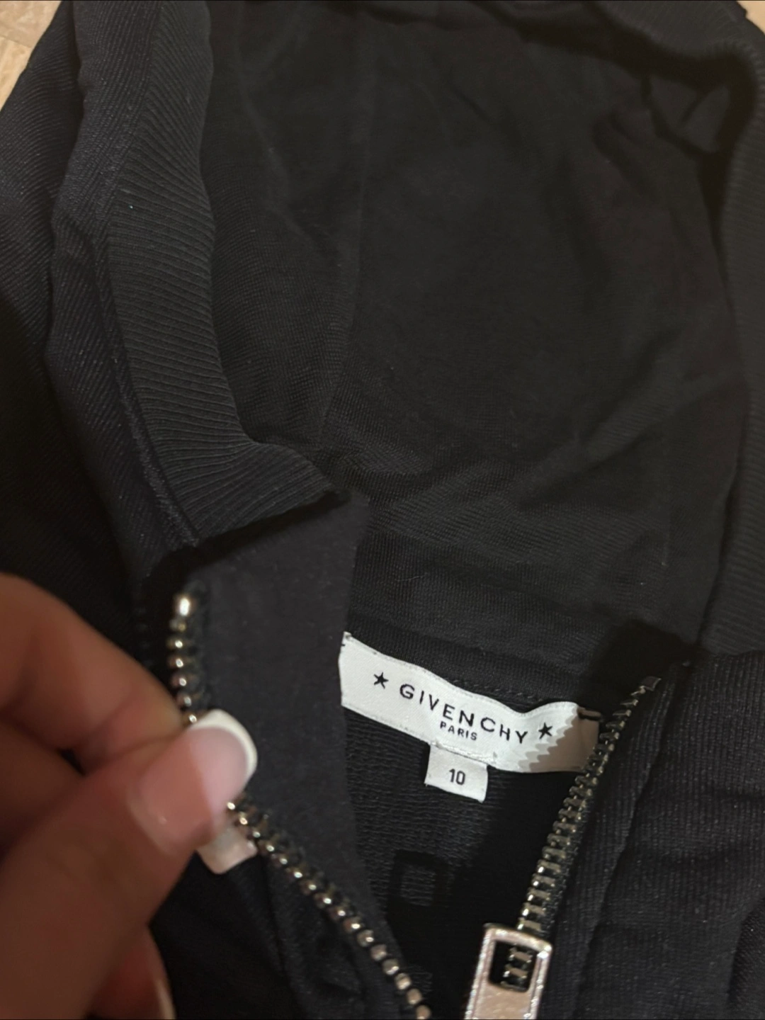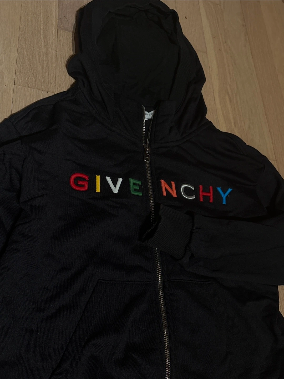 Selling a stylish (authentic) kid Givenchy black zip up hoodie! It features the brand name embroidered in a colourful design across the front. The size is a kids size 10! Need gone asap