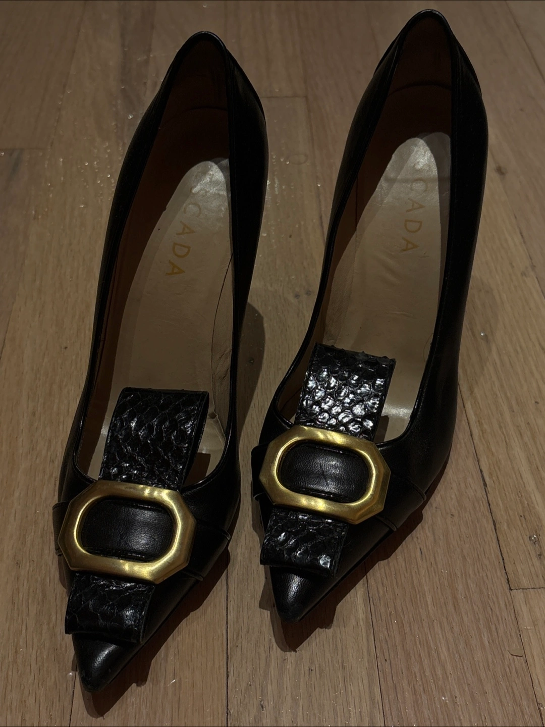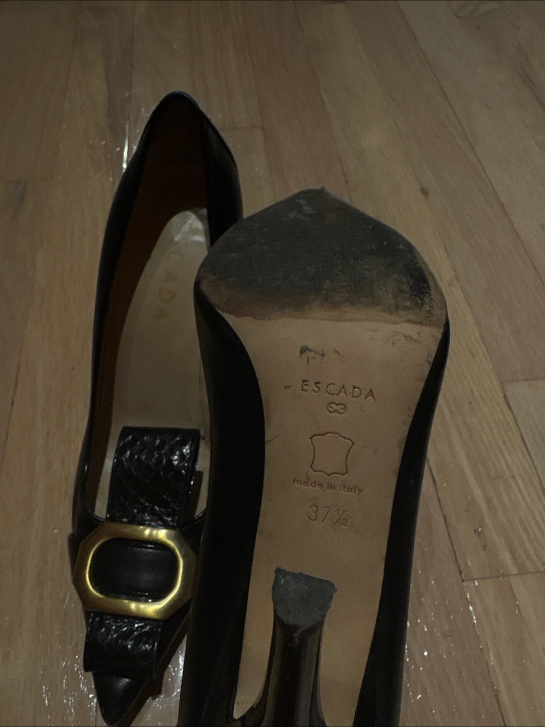 Selling a pair of Escada black leather heels. They are a European size 37.5 and made in Italy. They feature a gold buckle detail. Please see photos for condition.