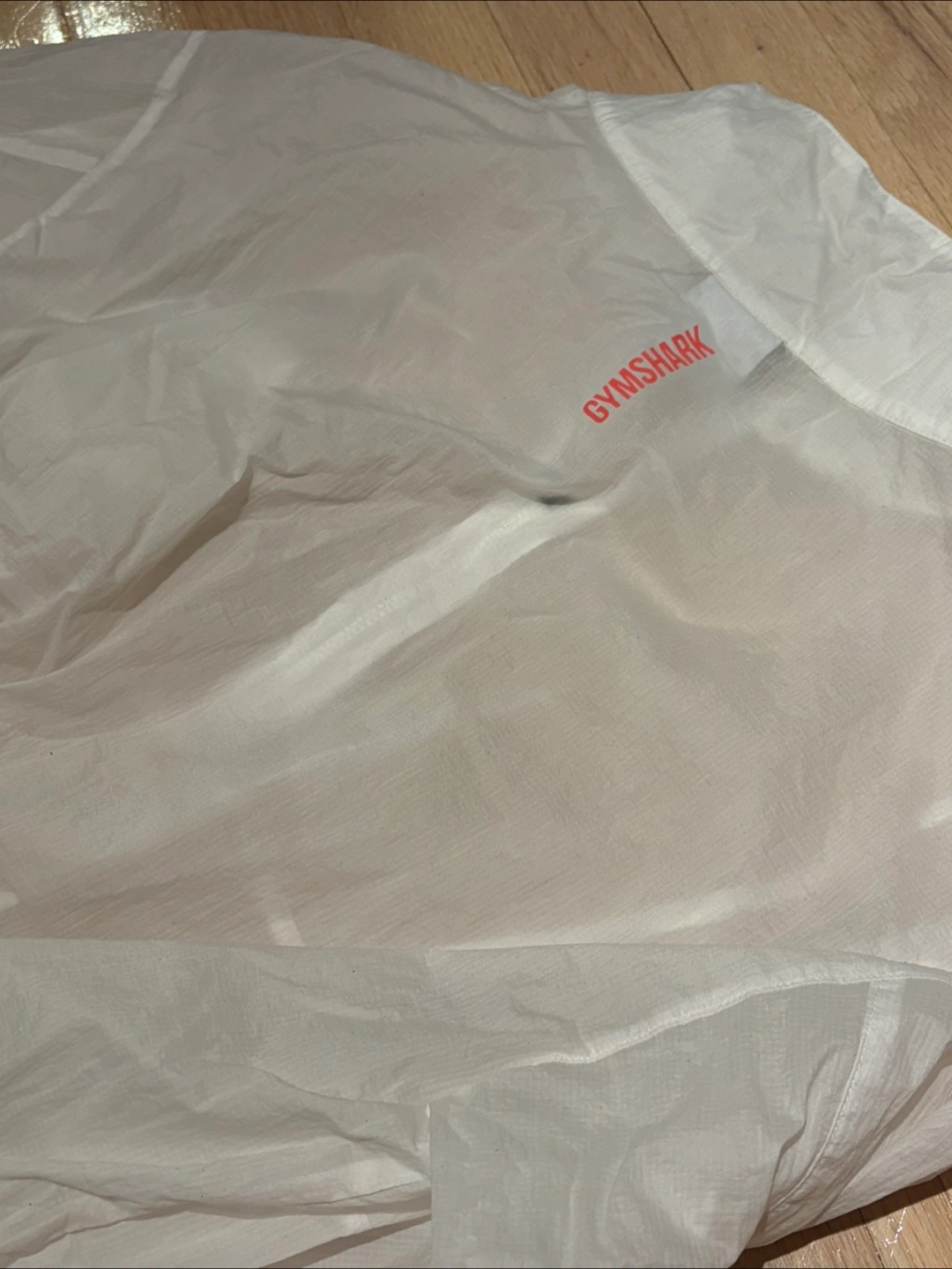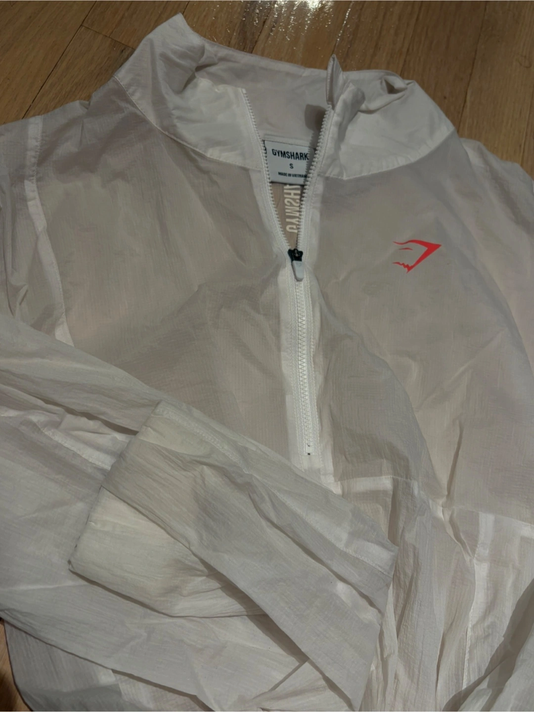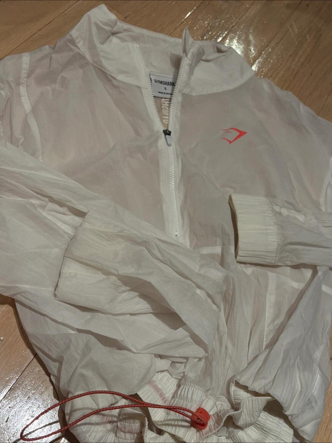 Selling a Gymshark windbreaker in white, size small. It's in great condition and perfect for layering! The lightweight material makes it ideal for outdoor activities or just a casual day out. Features the Gymshark logo and a comfortable fit.