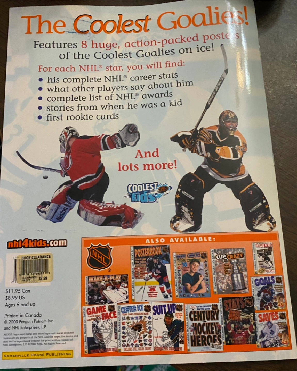 Selling a copy of the NHL Coolest Goalies Posterbook! It features 8 oversized pull-out posters of the coolest goalies on ice. You'll find career stats, quotes, awards, childhood stories, and first rookie cards for each NHL star!