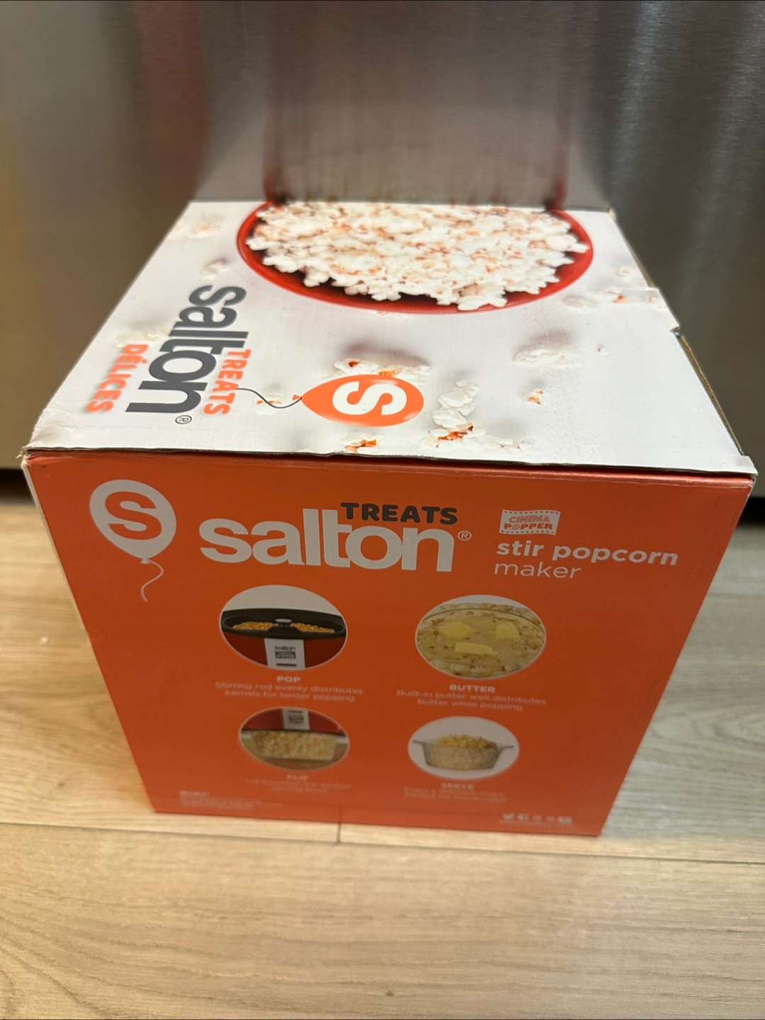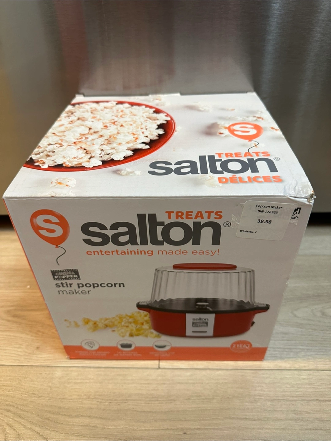 Selling a Salton Treats stir popcorn maker! The box says 'entertaining made easy!' and it was originally $39.98. It also mentions that the stirring rod evenly distributes and has a built-in butter melter while popping. The box is included!