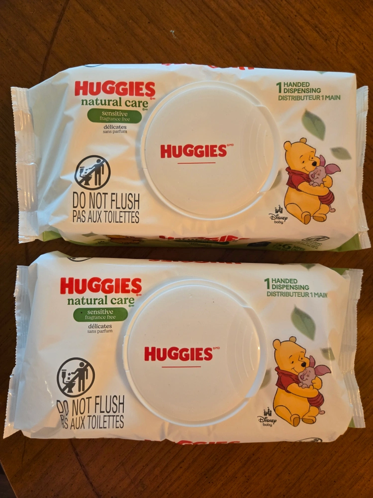 Two packs of Huggies Natural Care sensitive wipes. These wipes are fragrance-free and gentle on baby's skin. They also feature a one-handed dispensing design. Perfect for quick and easy cleanups!