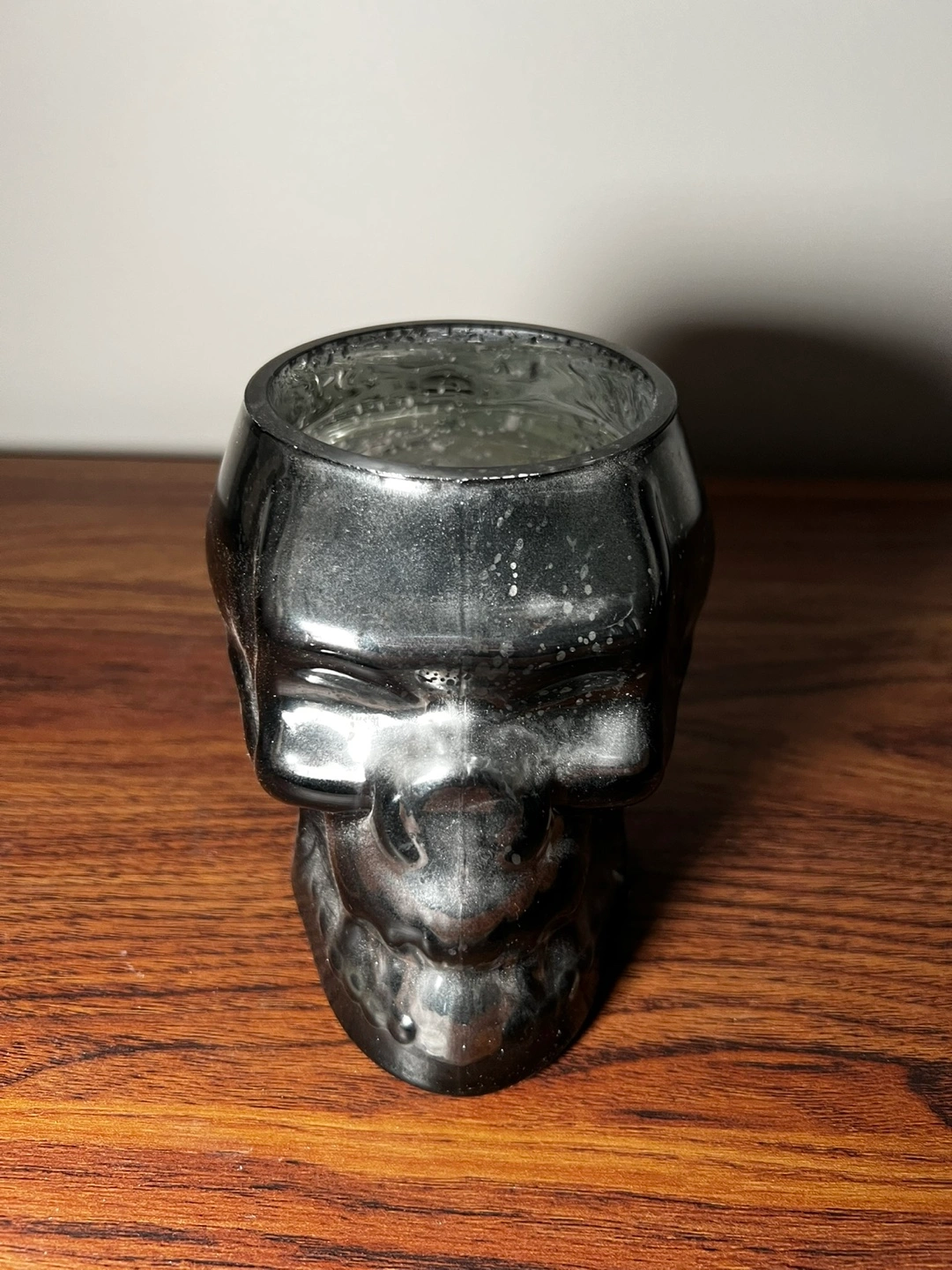 Silver skull shaped candle holder, perfect for adding a spooky touch to your home decor!