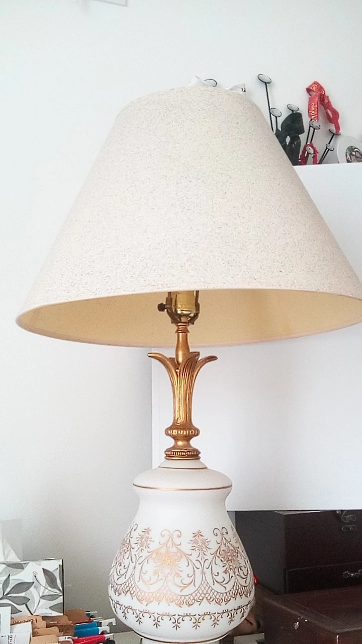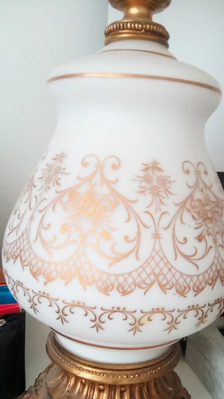 Selling a beautiful Milk Glass vintage accent lamp with a gold and white design. It has a unique ornate base and a patterned glass body. The lamp is in good condition and would add a touch of elegance to any room!