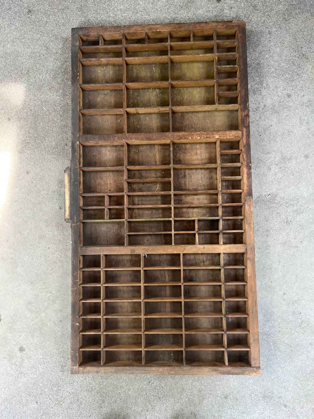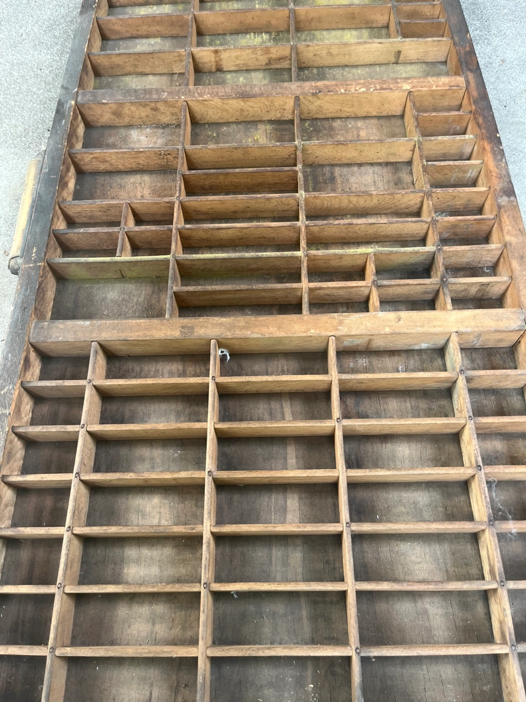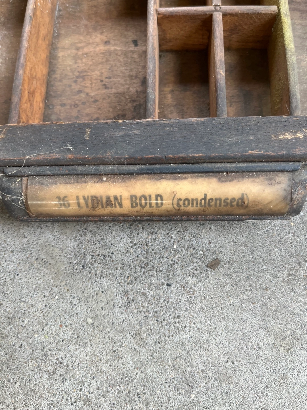 Selling a vintage wooden letterpress tray! It appears to be a 36 Lydian Bold (condensed) type, perfect for collectors or unique home decor. It's a great piece with lots of character and history