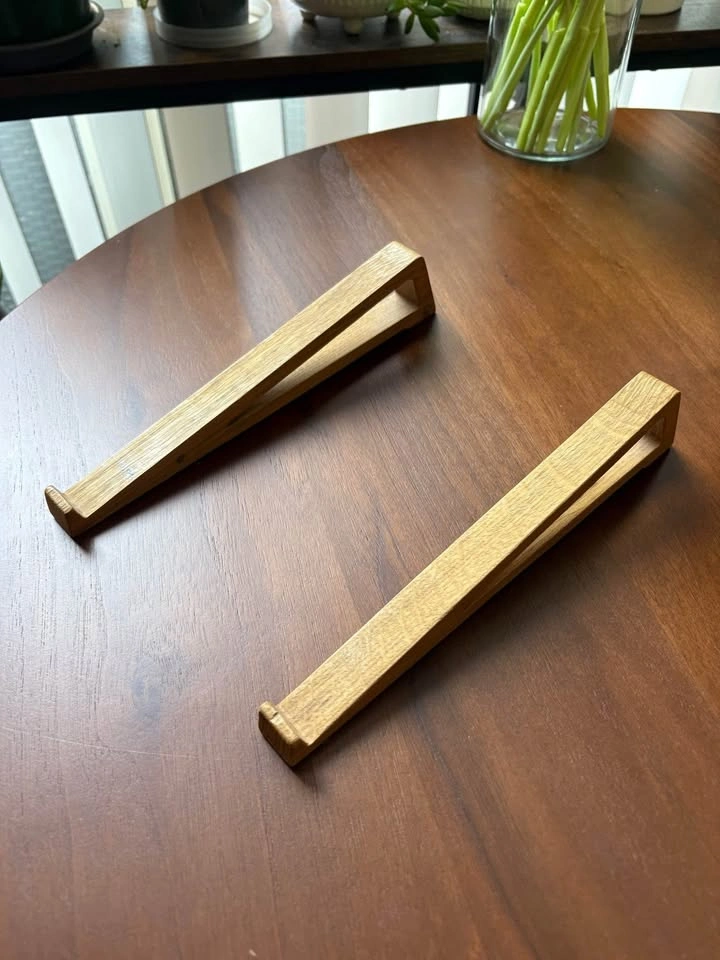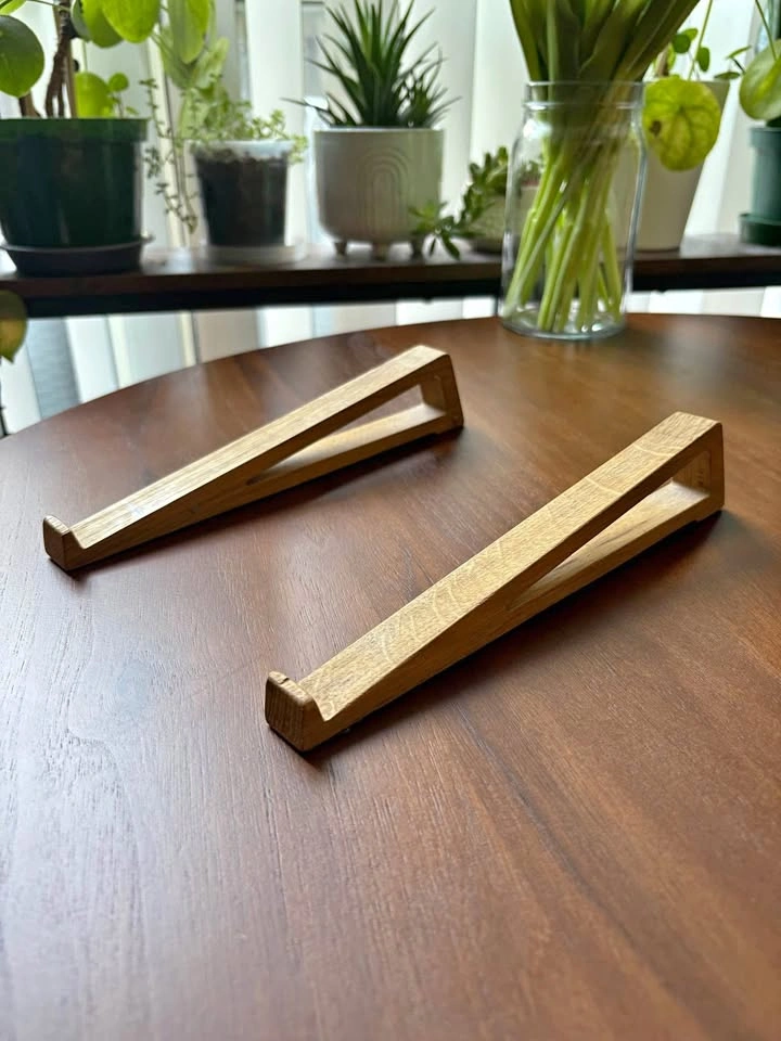 Wooden laptop stand with magnets. It’s two pieces so can be used with any size laptop. It’s portable, and great for storage when not in use. There’s some wear on the pads in the back (see photos). Very low profile, lightweight, and visually appealing. Each leg measures approximately 9.25x0.75 inches. Cash only, and pickup only near Yonge & Davisville.