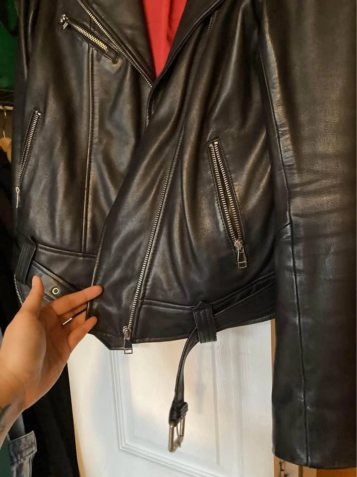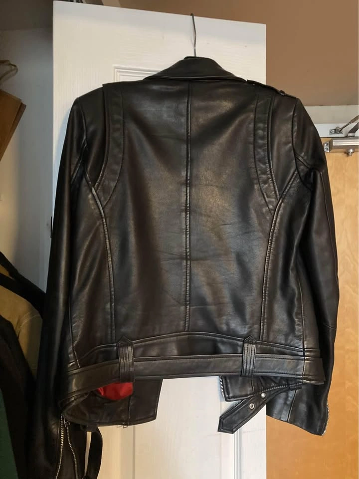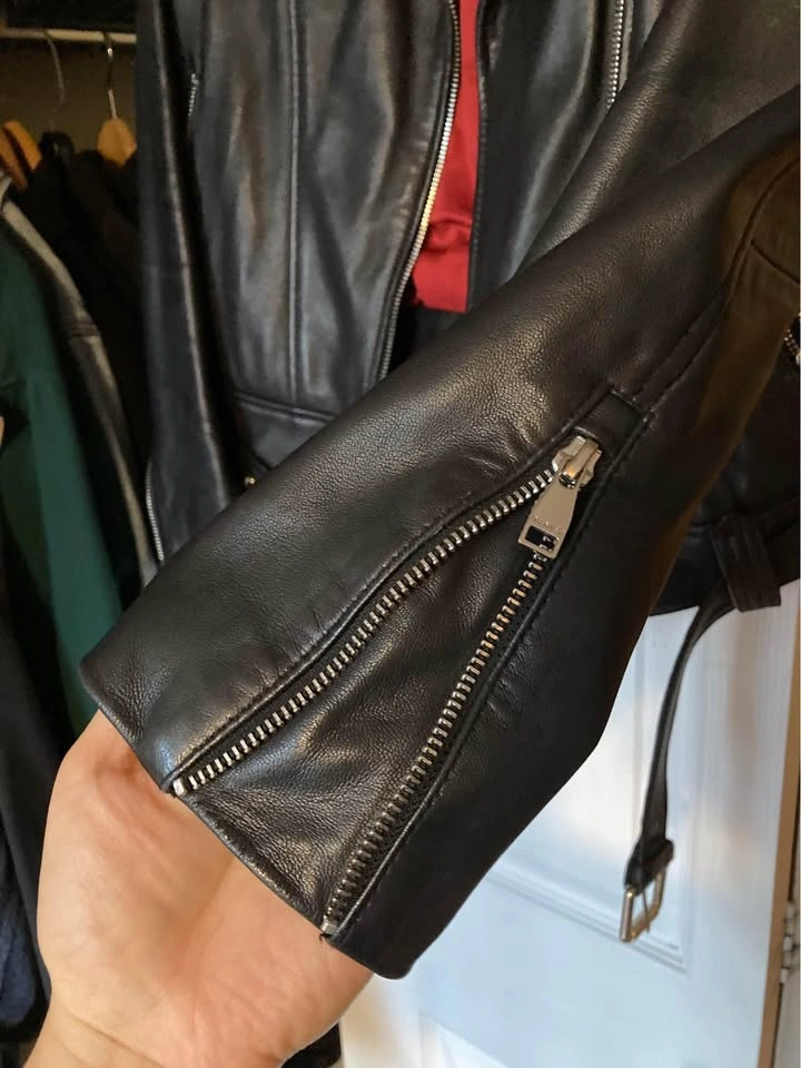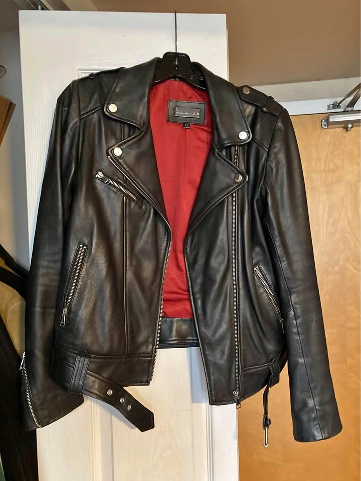 Danier genuine leather moto jacket, with multiple zip details, zippered pockets, a detachable belt, and beautiful deep red lining. In fantastic condition (no rips or marks), the leather is super soft and has a great sheen to it. Size XS Pickup at Yonge & Davisville