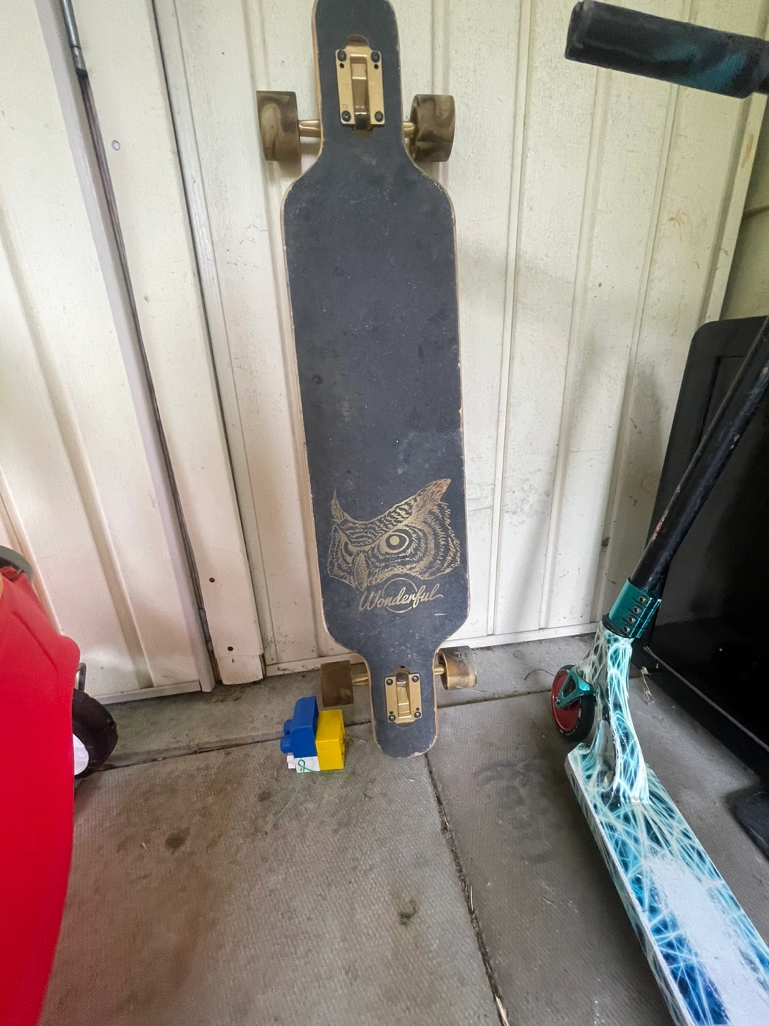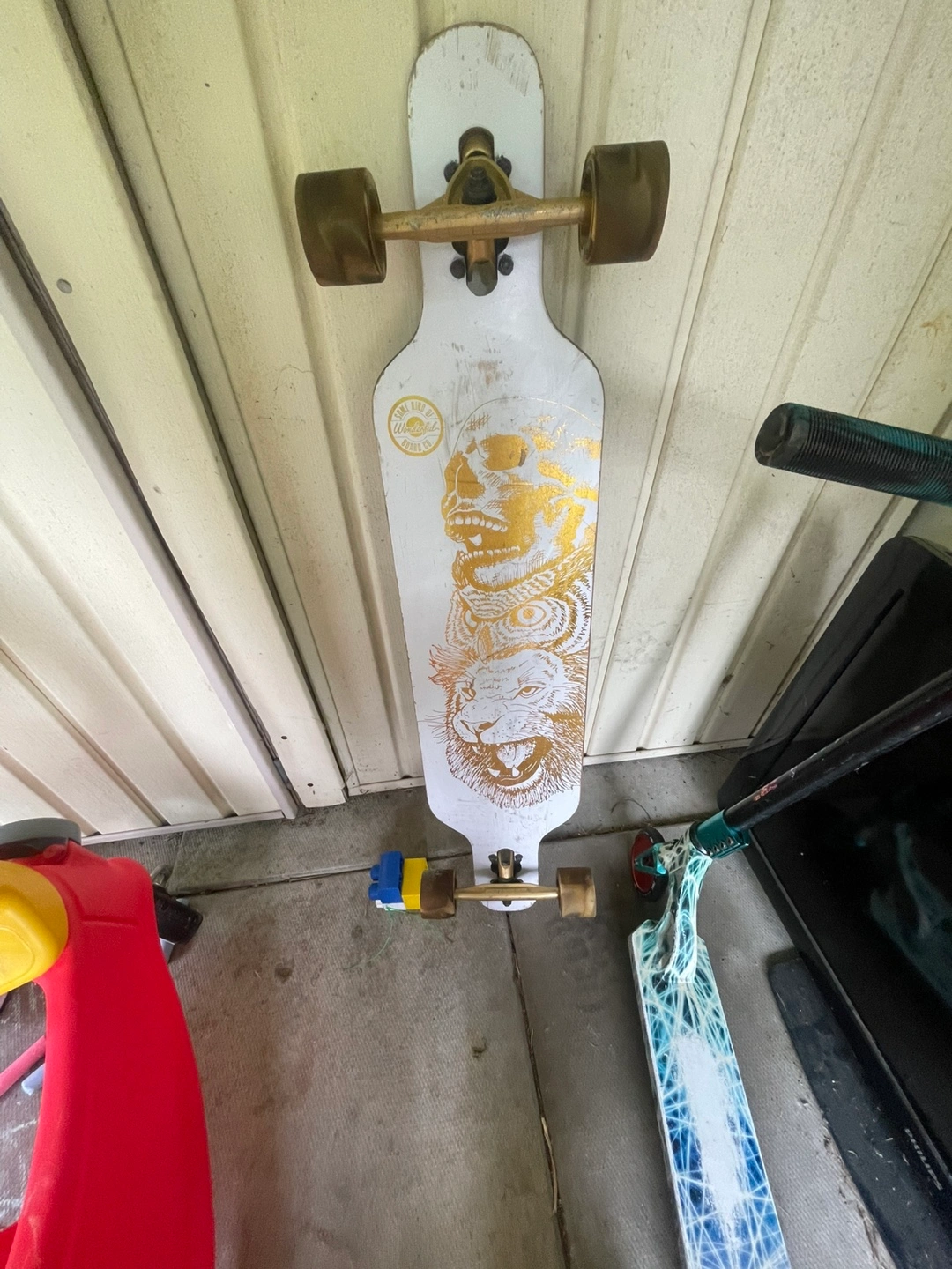 Selling a longboard with a cool graphic design! It features a unique owl design on one side and a skull and tiger design on the other. It's ready for some cruising around town