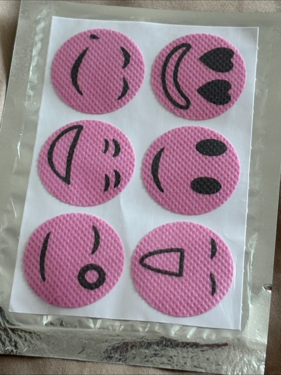 I'm selling a sheet of cute pink insect repellant stickers with smiley face designs! They're great to get rid of insects. Only available for pick up.