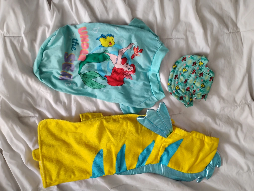 A cute Little Mermaid Ariel pet t-shirt size medium comes with Sebastian,& flounder pet sun visor size small and a flounder hooded pet towel size s/m sold as a set or individually